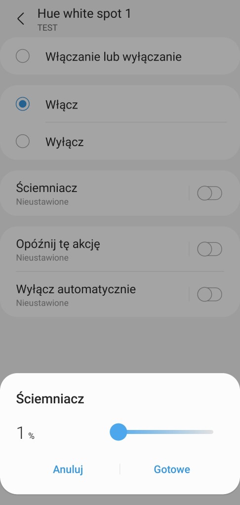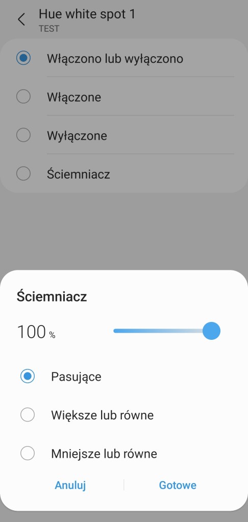 Tworzenie automatyzacji „Jeśli … to Wtedy” musimy podzielić na dwa etapy, ponieważ znacznie różnią się dostępne opcje, jeśli inicjujemy warunek „Jeśli”. W pierwszej możliwości „Jeśli” urządzenie pozwala na wybranie opcji „Włączono lub wyłączono” czyli zmiana stanu, oraz „Włączone” i „Wyłączone” oraz wartość ściemniacza. Dodatkowo opcję jak długo zachowany powinien być stan przed uruchomieniem automatyzacji oraz czy ma być to warunek wstępny. W drugiej możliwości „Wtedy”, reflektor pozwala na więcej. Mamy ponownie opcje „Włączono lub wyłączono” czyli zmiana stanu, oraz „Włączone” i „Wyłączone”. Ustawienie jasności żarówki z zakresu 0 – 100% oraz dodatkowo akcję uruchomienia reflektora możemy opóźnić o dowolny czas, jak i wyłączyć ją automatycznie po ustalonym czasie.