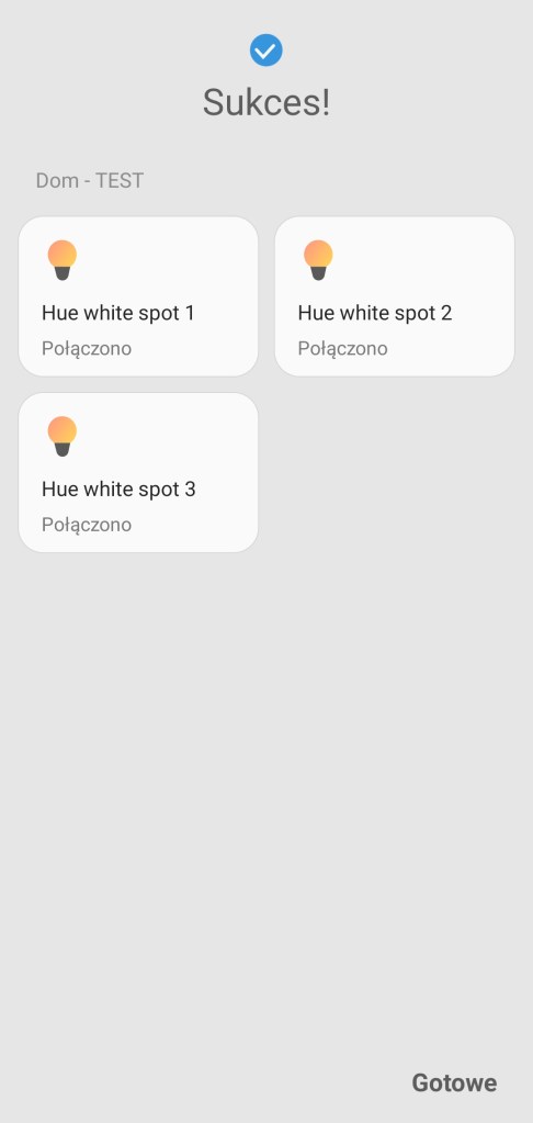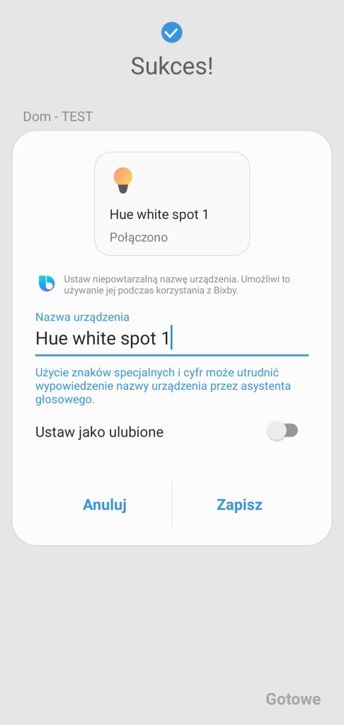 Po dodaniu wszystkich żarówek w aplikacji Philips Hue, możemy przystąpić do dodania ich do ekosystemu SmartThings. Przechodzimy do aplikacji SmartThings, na ekranie głównym aplikacji, klikamy plus ( + ), kolejno Urządzenie, znajdujemy markę Philips Hue >> Oświetlenie. I dodanie poprzez Philips Hue with SmartThings Hub, klikamy Rozpoczęcie, uruchamiając proces konfiguracji. Wybieramy hub i pokój dla nowego urządzenia. Po chwili zostaną znalezione żarówki i dodane do inteligentnego domu. Kończymy proces instalacji, klikając Gotowe.