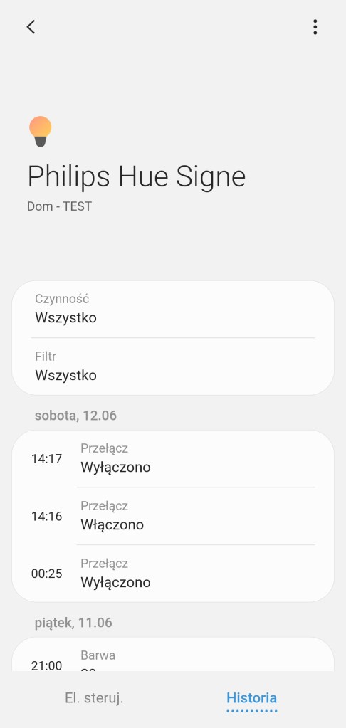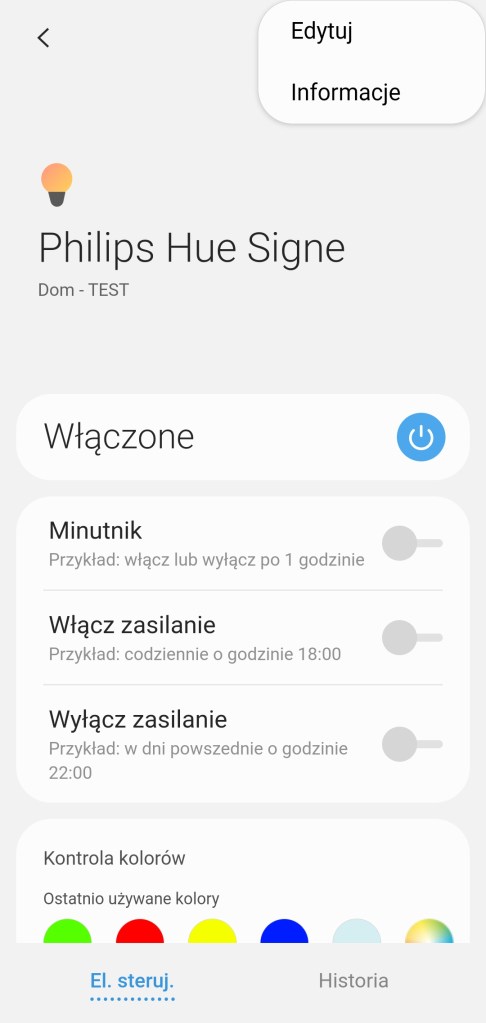 W głównym panelu aplikacji mamy możliwość włączenia/wyłączenia lampy Signe, zaprogramowania szybkich automatyzacji: włączenia i wyłączenia lampy LED oraz pewną formę minutnika. Poniżej posiadamy możliwość ustawienia dowolnego koloru z palety barw RGB, jak i pięć ostatnio używanych barw oraz sześć sugestii. Kolejna belka pozwala na ustawienie ściemniacza od 1 do 100%. Pod ściemniaczem posiadamy również pięć kół, będących przyciskami ustawiającymi ściemniacz kolejno od lewej na 10%, 30%, 50%, 70% oraz 90% jasności. Ostatnia opcja to ustawienie temperatury światła w zakresie 2000 K – 6500 K. Panel „Historii” nie różni się znacznie od innych urządzeń, mamy dostęp do sortowania i przestudiowania historii działań lampy. W ustawieniach „Edytuj” mamy standardową możliwość zmiany nazwy, lokalizacji, pokoju oraz dodania do panelu „Ulubione”.