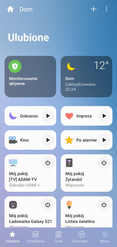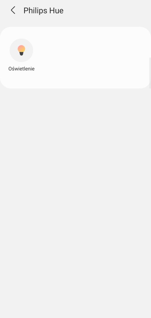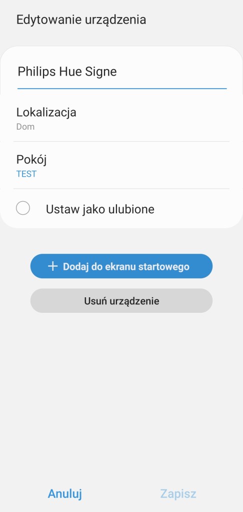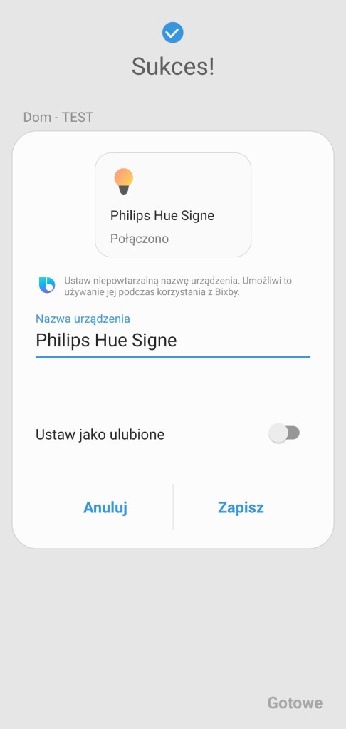 Po dodaniu lampy Signe w aplikacji Philips Hue, możemy przystąpić do dodania jej do ekosystemu SmartThings. Przechodzimy do aplikacji SmartThings, na ekranie głównym aplikacji, klikamy plus ( + ) znajdujący się w prawym górnym rogu ekranu, kolejno Urządzenie, znajdujemy markę Philips Hue >> Oświetlenie. I dodanie poprzez Philips Hue with SmartThings Hub, klikamy Rozpoczęcie, uruchamiając proces konfiguracji. Wybieramy hub i pokój dla nowego urządzenia. Po chwili lampa zostanie odnaleziona i dodana do inteligentnego domu. Możemy zmienić nazwę lampy, aby zakończyć proces instalacji, klikamy Gotowe.