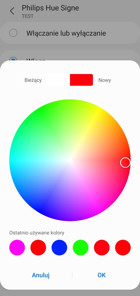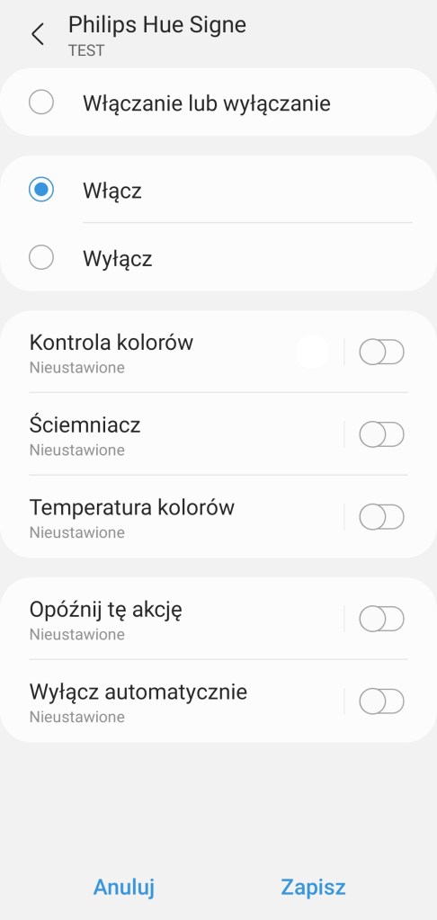 Tworzenie automatyzacji „Jeśli … to Wtedy” musimy podzielić na dwa etapy, ponieważ znacznie różnią się dostępne opcje jeśli inicjujemy warunek „Jeśli”. W pierwszej możliwości „Jeśli” urządzenie pozwala na wybranie opcji „Włączono lub wyłączono” czyli zmiana stanu, oraz „Włączone” i „Wyłączone” oraz wartość ściemniacza i temperatury kolorów. Dodatkowo posiadamy opcję jak długo zachowany powinien być stan przed uruchomieniem automatyzacji oraz czy ma być to warunek wstępny. W drugiej możliwości „Wtedy”, lampa pozwala na dużo więcej, mamy pełną możliwość tworzenia opcji przydatnych w programowaniu już np. scenerii. Mamy ponownie opcje „Włączono lub wyłączono” czyli zmiana stanu, oraz „Włączone” i „Wyłączone”. Ustawienie jednego z 16 milionów kolorów, jasności lampy z zakresu 0 – 100%, bądź temperatury barwy z zakresu 2000 – 6500 K. Akcję uruchomienia lampy możemy opóźnić o dowolny czas, jak i wyłączyć ją automatycznie po ustalonym czasie.