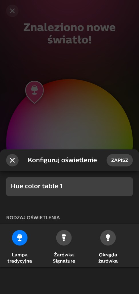 Jeśli posiadamy mostek Hue i centralę SmartThings możemy przejść do tradycyjnej instalacji. W pierwszej kolejności musimy połączyć Signe z mostkiem i aplikacją Philips Hue. W tym celu musimy pobrać aplikację z Google Store bądź AppStore (iOS 12.0 lub nowszy). Po zainstalowaniu aplikacji, uruchamiamy ją. Aby wyszukać nowe urządzenie, musimy przejść do Ustawienia aplikacji, klikamy w prawym dolny róg ekranu. Z dostępnych opcji, kliknij Światła, następnie plus ( + ) znajdujący się w prawym górnym rogu. Należy upewnić się, że lampa podłączona jest do zasilania. Możemy lampę dodać poprzez wpisanie numeru seryjnego (znajduje się on na obudowie) lub poprzez wyszukanie, klikamy Wyszukaj. Po chwili zostanie ona wykryta, nadajemy jej nazwę i zatwierdzamy klikając Zapisz. Następnie umieszczamy ją w pokoju, w tym celu przeciągnij Signe do wybranego pokoju i klikamy Gotowe.