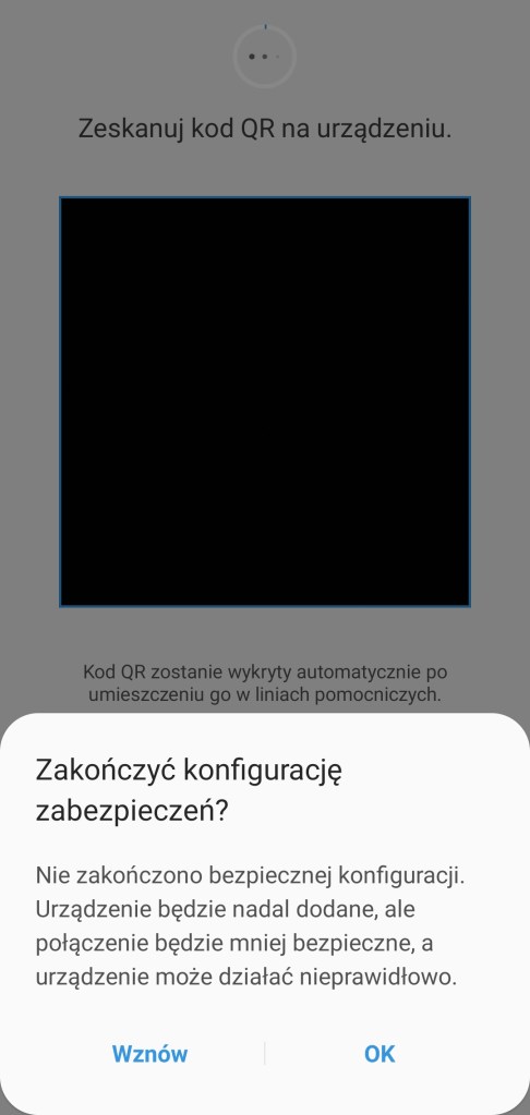 Instalacja wtyczki jest prosta, choć nie obyło się bez niespodzianek. Na początku podłączamy włącznik do gniazdka elektrycznego. Aby zainstalować urządzenie należy postępować zgodnie z instrukcją w aplikacji SmartThings. Na ekranie głównym aplikacji klikamy + „Dodaj”, następnie „Urządzenie”, wybieramy markę NEO Coolcam, dalej klikamy „Gniazdko”, ponownie wybieramy producenta. Zaczynamy proces dodawania do ekosystemu, wybieramy centralę oraz pokój, w jakim ma się znaleźć wtyczka. Następnie na gniazdku należy szybko trzy razy kliknąć przycisk. Pojawi się okno skanowania kodu QR. Niestety ani kodu ani PINu, nie otrzymaliśmy w pudełku, tym samym nie możemy podłączyć urządzenia z najwyższymi zabezpieczeniami. Klikamy systemowy „wstecz”, zostaniemy zapytani czy zakończyć konfigurację zabezpieczeń, klikamy „Ok”. Ponownie wyświetli się błąd o dodaniu urządzenia bez zabezpieczeń Z-wave S2, klikamy „Pomiń” >> „Ok”. Teraz wystarczy nadać nazwę inteligentnej wtyczce i klikamy „Gotowe”.