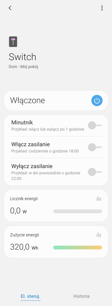 W głównym panelu aplikacji mamy możliwość włączenia i wyłączenia gniazdka oraz możliwość uruchomienia szybkich automatyzacji np. minutnika. Posiadamy aktualną informację o poborze energii elektrycznej oraz dane o bieżącym zużyciu. Panel „Historii” również nie różni się znacznie od innych urządzeń, mamy dostęp do sortowania i przestudiowania historii działań gniazdka. W ustawieniach „Edytuj” mamy standardową możliwość zmiany nazwy, lokalizacji, pokoju oraz opcję usunięcia urządzenia.