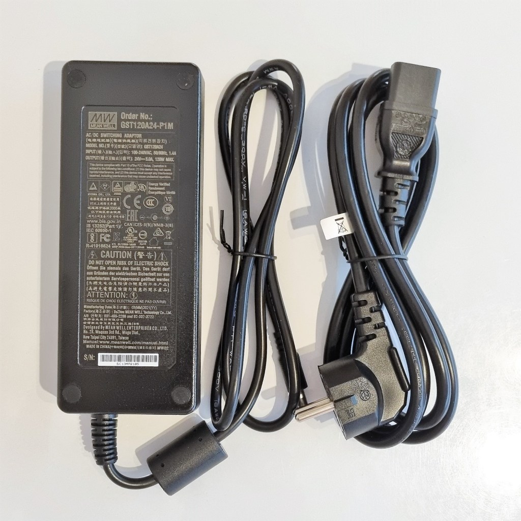 Producent zaleca skorzystanie z zasilacza Mean Well 24V do sterowników LED. Zasilacz ma całkowitą moc wyjściową 24V i max. 120W. Ponadto jest wyposażony we wtyk typu F (wtyczka z bolcem) do zasilania wejściowego oraz złącze P1M do zasilania wyjściowego. Przykładowo taśma LED 24W/m może mieć maksymalną długość 5m. Jeśli długość przekracza ten limit, zaleca się posiadanie drugiego zasilacza wejściowego, aby uzyskać maksymalną wydajność światła. Niestety zasilacz jest dość duży.