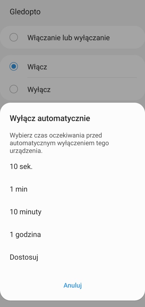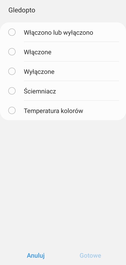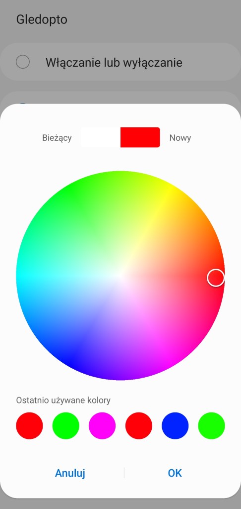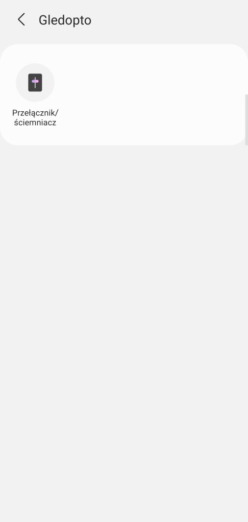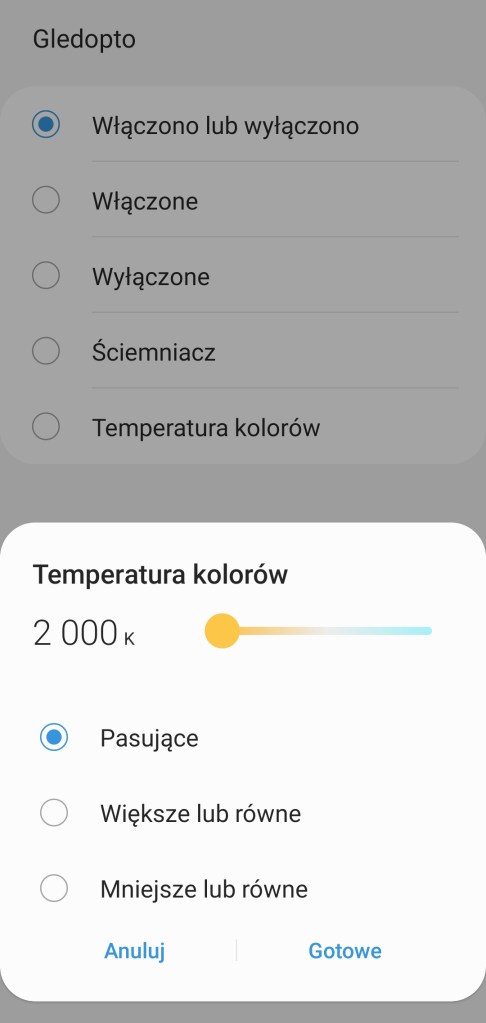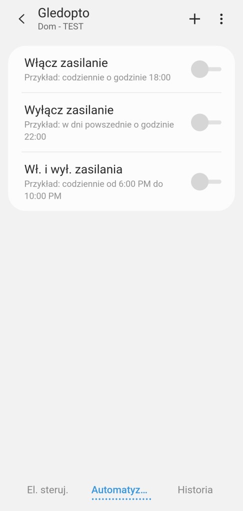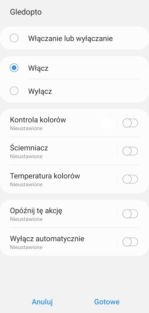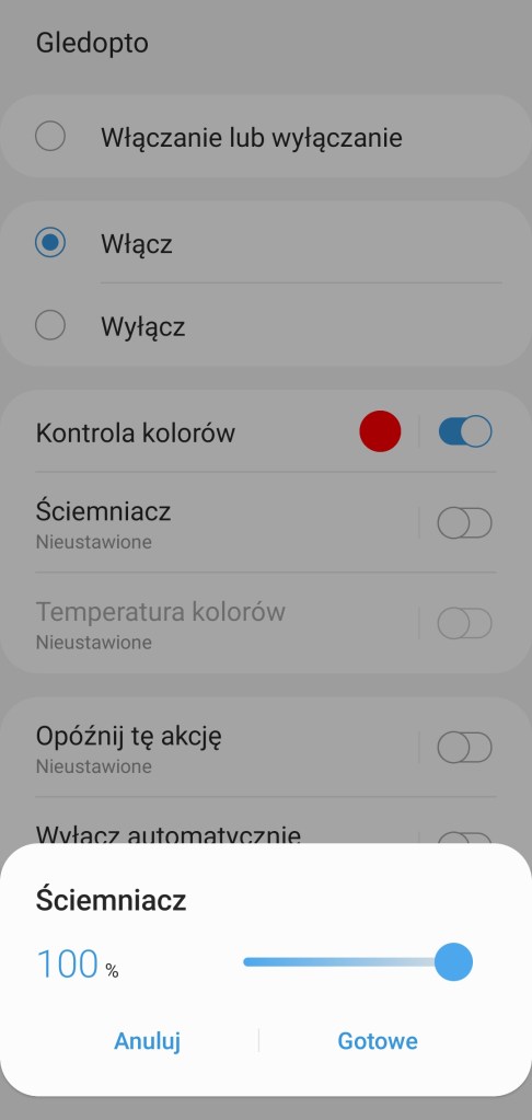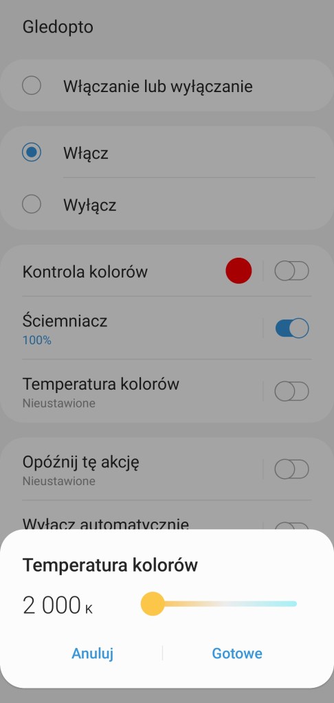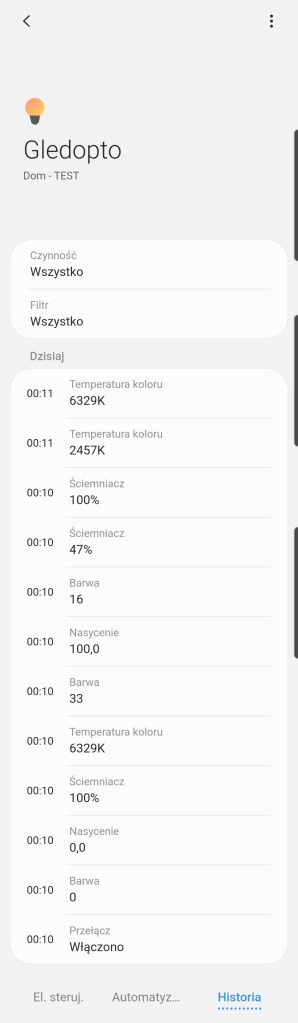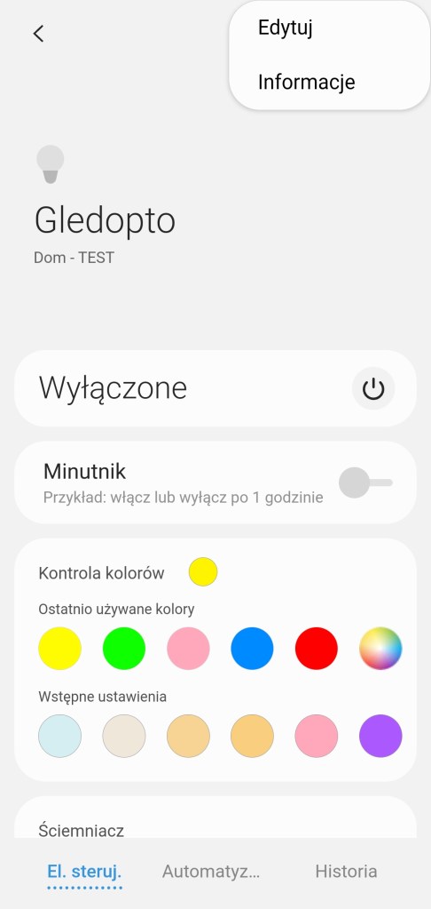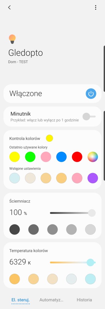 W głównym panelu aplikacji mamy możliwość włączenia/wyłączenia sterownika Gledopto, zaprogramowania minutnika. Poniżej posiadamy możliwość ustawienia dowolnego koloru z palety barw RGBW, jak i pięć ostatnio używanych barw oraz sześć sugestii. Kolejna belka pozwala na ustawienie ściemniacza od 1 do 100%. Pod ściemniaczem posiadamy również pięć kół, będących przyciskami ustawiającymi ściemniacz kolejno od lewej na 10%, 30%, 50%, 70% oraz 90% jasności. Ostatnia opcja to ustawienie temperatury światła w zakresie 2000 K – 6500 K. Nowość czyli panel „Automatyzacje” znajdziemy tutaj szybkie automatyzacje: włączenia i wyłączenia taśmy LED o danej porze dnia oraz listę automatyzacji gdzie podpięte jest urządzenie. Panel „Historii” nie różni się od innych urządzeń, mamy dostęp do sortowania i przestudiowania historii działań listwy. W ustawieniach „Edytuj” mamy standardową możliwość zmiany nazwy, lokalizacji, pokoju oraz dodania do panelu „Ulubione”.