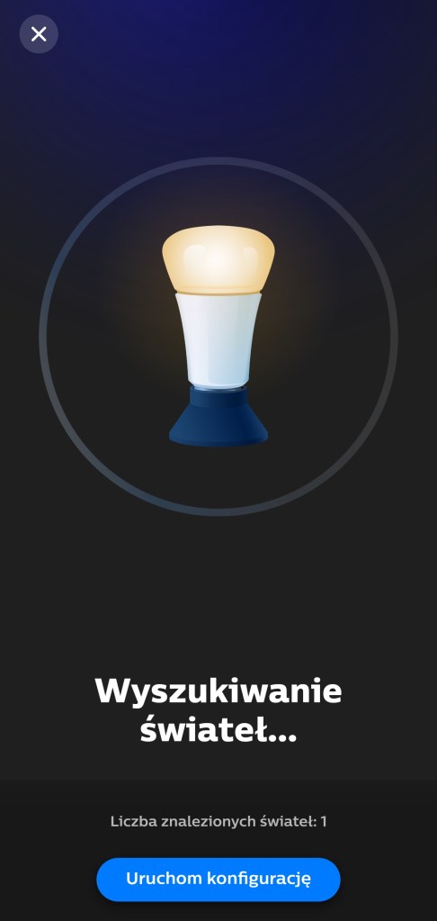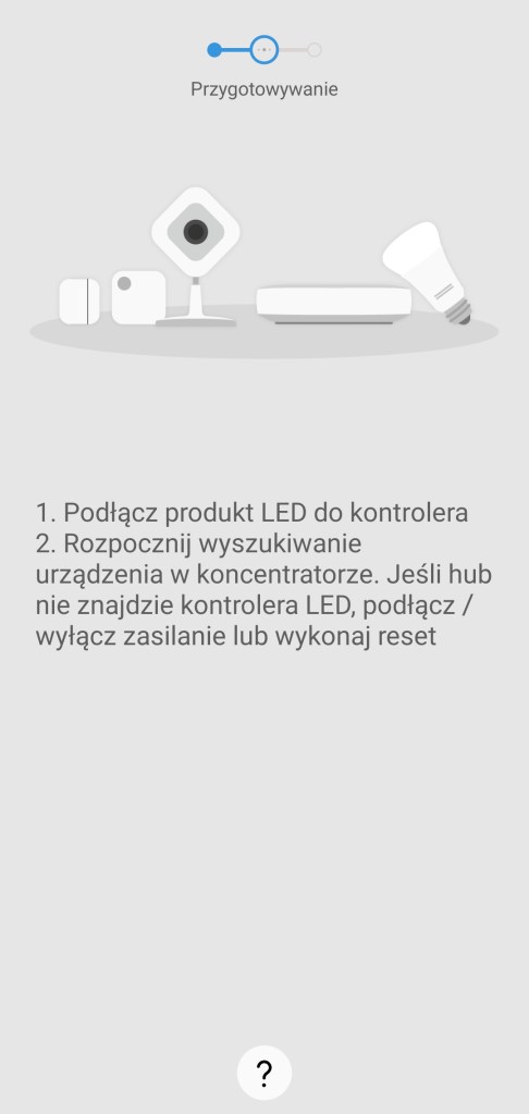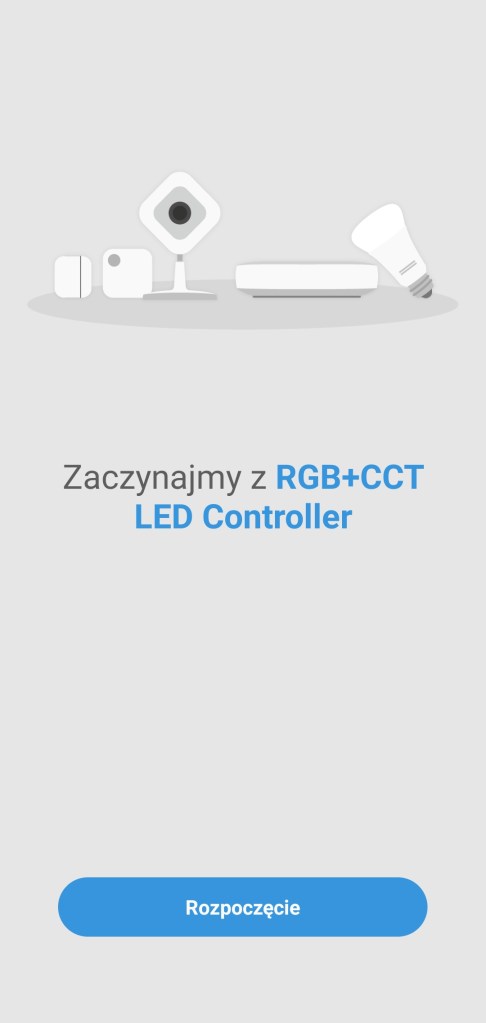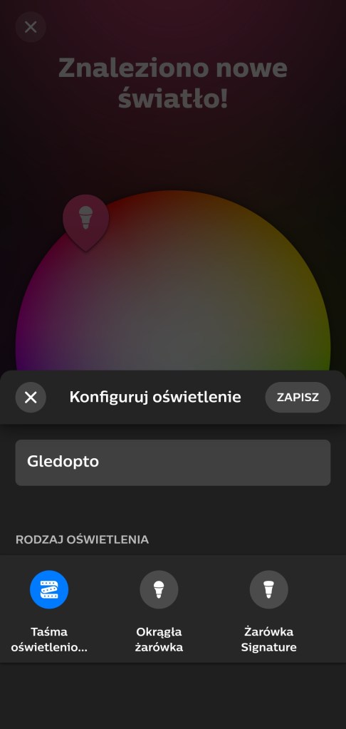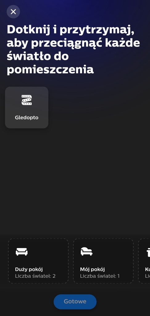 W pierwszej kolejności musimy połączyć sterownik z mostkiem i aplikacją Philips Hue. W tym celu musimy pobrać aplikację z Google Store bądź AppStore (iOS 12.0 lub nowszy). Po zainstalowaniu aplikacji, uruchamiamy ją. Aby wyszukać nowe urządzenia, musimy przejść do Ustawienia aplikacji, klikamy w prawym dolny róg ekranu. Z dostępnych opcji, kliknij Światła, następnie plus ( + ) znajdujący się w prawym górnym rogu. Należy upewnić się, że sterownik jest podłączony do zasilania. Klikamy Wyszukaj, w celu odnalezienia urządzenia. To może chwilę potrwać. Jeśli nie zostanie znaleziony, odłącz sterownik od zasilania i podłącz go ponownie lub wykonaj reset. Po wyszukaniu taśmy LED, nadajemy jej nazwę, wybieramy ikonę i zatwierdzamy klikając Zapisz. Następnie umieszczamy ją w pokoju, przeciągając do wybranego, klikamy Gotowe. Po zakończeniu ukaże się komunikat o gotowości do użytku.