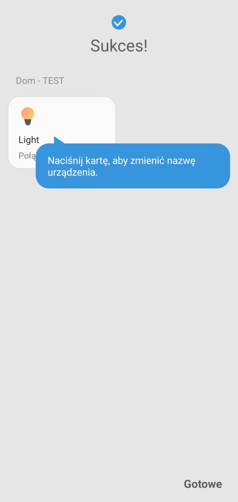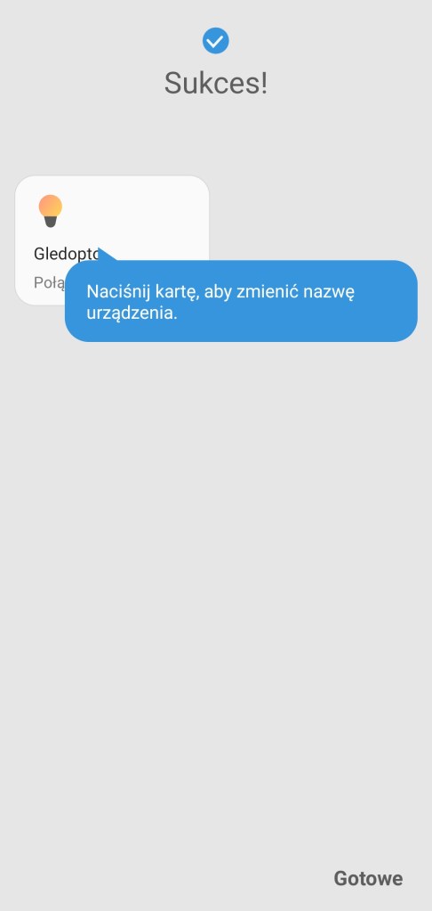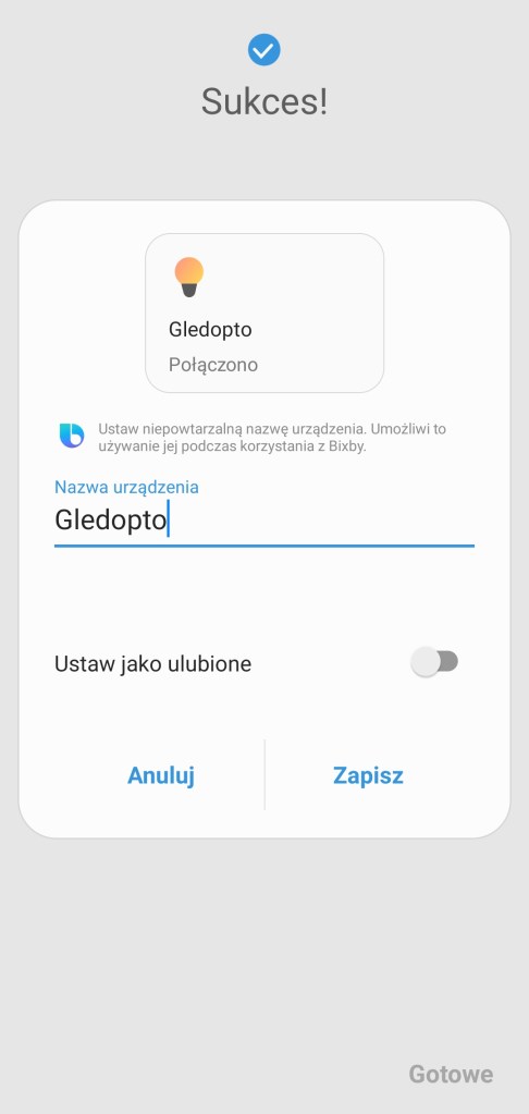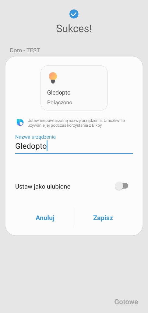 Na początku podłączamy sterownik do zasilania. Instalacja sterownika jest prosta, aby zainstalować urządzenie należy postępować zgodnie z instrukcją w aplikacji SmartThings. Na ekranie głównym aplikacji klikamy Dodaj ( + ), następnie Urządzenie, wybieramy markę Gledopto, dalej klikamy Przełącznik/ściemniacz, wybieramy sterownik z listy dostępnych. Zaczynamy proces dodawania do ekosystemu, wybieramy centralę oraz pokój, w jakim ma się znaleźć taśma LED. To może chwilę potrwać. Jeśli nie zostanie znaleziony, odłącz sterownik od zasilania i podłącz go ponownie lub wykonaj reset. Po znalezieniu urządzenia możemy zmienić mu nazwę, aby zakończyć proces instalacji, klikamy Zapisz i Gotowe.