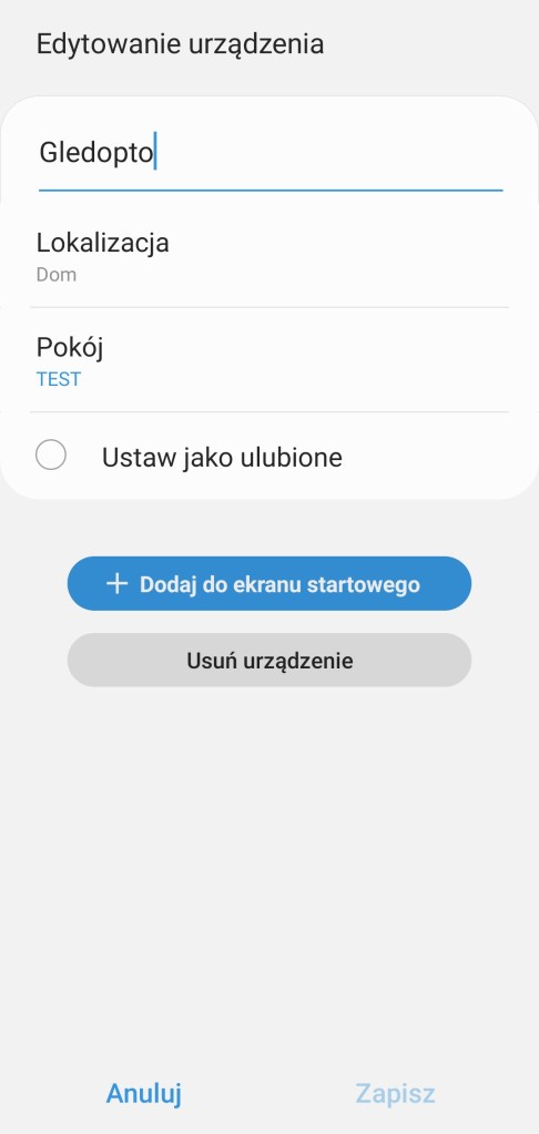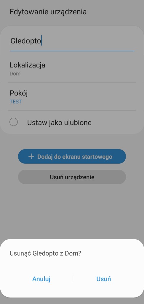 Aby usunąć sterownik Gledopto z ekosystemu SmartThings, należy wejść w główny ekran urządzenia. Kliknąć Więcej opcji ( ⋮ ) w prawym górnym rogu ekranu, a następnie Edytuj. W panelu edycji, wybieramy Usuń urządzenie. Następnie potwierdzamy operację, stukając Usuń.