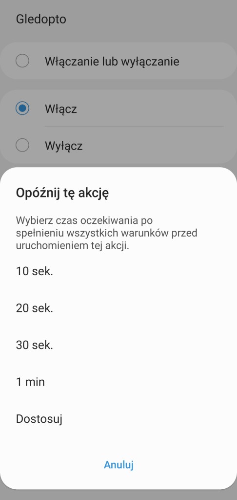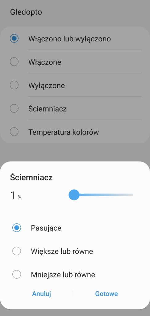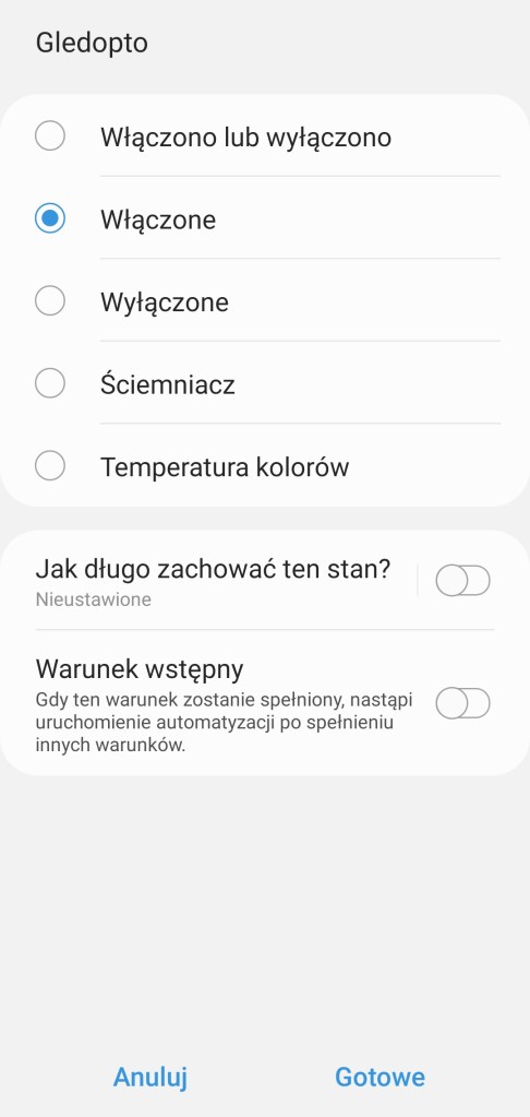 Tworzenie automatyzacji „Jeśli … to Wtedy” musimy podzielić na dwa etapy, ponieważ znacznie różnią się dostępne opcje jeśli inicjujemy warunek „Jeśli”. W pierwszej możliwości „Jeśli” sterownik pozwala na wybranie opcji „Włączono lub wyłączono” czyli zmiana stanu, oraz „Włączone” i „Wyłączone” oraz wartość ściemniacza i temperatury kolorów. Dodatkowo posiadamy opcję jak długo zachowany powinien być stan przed uruchomieniem automatyzacji oraz czy ma być to warunek wstępny. W drugiej możliwości „Wtedy”, sterownik pozwala na ciut więcej, mamy pełną możliwość tworzenia opcji przydatnych w programowaniu już np. scenerii. Mamy ponownie opcje „Włączono lub wyłączono” czyli zmiana stanu, oraz „Włączone” i „Wyłączone”. Ustawienie jednego koloru z palety barw RGBW, jasności światła z zakresu 0 – 100%, bądź temperatury barwy z zakresu 2000 – 6500 K. Akcję uruchomienia możemy opóźnić o dowolny czas, jak i wyłączyć ją automatycznie po ustalonym czasie.