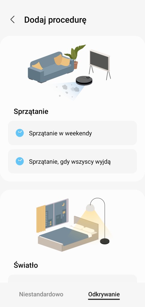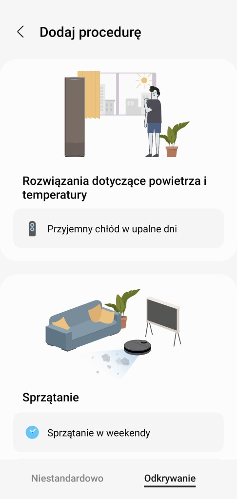 Wprowadzono zakładkę „Odkrywanie” w niej znajdziemy rekomendacje i podpowiedzi utworzenia „Procedur” oraz SmartApps. Zobacz popularne procedury, które można tworzyć na swoim urządzeniu. Możesz także dodać SmartApps na dole zakładki.
