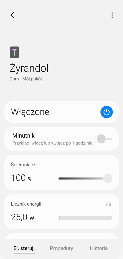 Dodaj procedurę ze strony urządzenia. Nastąpiła zmiana nazwy, zakładki w panelu urządzenia, od teraz nazywa się Procedury. Znajdziemy w niej spis wszystkich procedur w których wykorzystywane jest dane urządzenie. Nowością jest dodawanie procedury z tego poziomu aplikacji, wystarczy kliknąć plus ( + ) w prawym górnym rogu, aby dodać nową automatyzację.