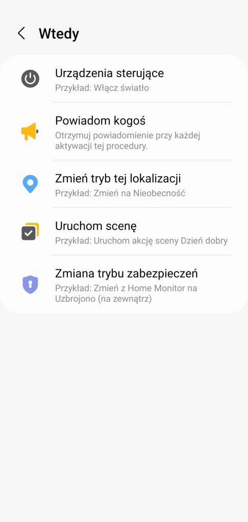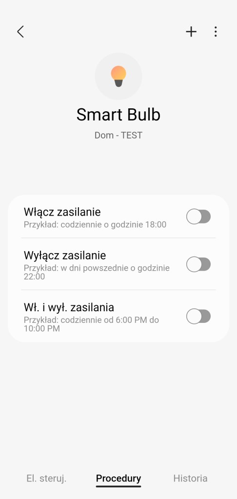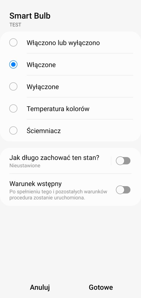 Tworzenie procedur (dawniej automatyzacje) „Jeśli … to Wtedy” musimy podzielić na dwa etapy, ponieważ znacznie różnią się dostępne opcje, jeśli inicjujemy warunek „Jeśli”. W pierwszej możliwości „Jeśli” urządzenie pozwala na wybranie opcji „Włączono lub wyłączono” czyli zmiana stanu, oraz „Włączone” i „Wyłączone”. Poniżej mamy wartość ściemniacza i temperatury kolorów z zakresu 2200 – 9000 K. Choć wiemy, że żarówka pozwala na zakres 2700 – 6500 K. Dodatkowo posiadamy opcję jak długo zachowany powinien być stan przed uruchomieniem automatyzacji oraz czy ma być to warunek wstępny. W drugiej możliwości „Wtedy”, świeczka pozwala na dużo więcej, mamy pełną możliwość tworzenia opcji przydatnych w programowaniu już np. scenerii. Mamy ponownie opcje „Włączono lub wyłączono” czyli zmiana stanu, oraz „Włączone” i „Wyłączone”. Ustawienie jednego z kolorów, jasności żarówki z zakresu 0 – 100%, bądź temperatury barwy z zakresu 2200 – 9000 K. Choć wiemy, że żarówka pozwala na zakres 2700 – 6500 K. Akcję uruchomienia lampy możemy opóźnić o dowolny czas, jak i wyłączyć ją automatycznie po ustalonym czasie.