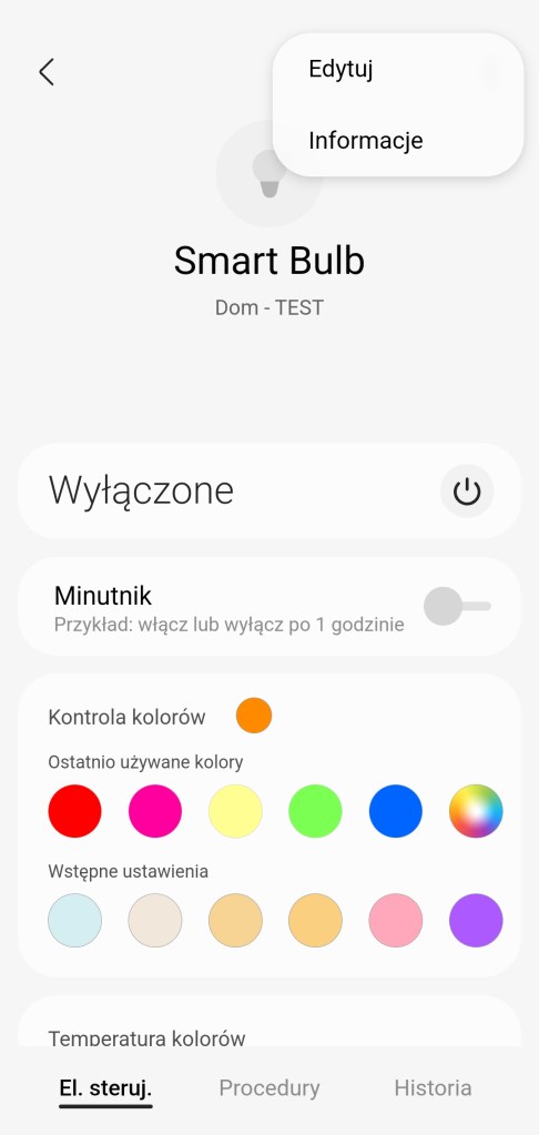 W głównym panelu aplikacji mamy możliwość włączenia/wyłączenia żarówki Meross, możliwość ustawienia minutnika. Poniżej posiadamy możliwość ustawienia dowolnego koloru z palety barw RGB, jak i pięć ostatnio używanych kolorów oraz sześć sugestii. Kolejna belka umożliwia ustawienie temperatury światła w zakresie 2200 K – 9000 K, choć realnie jest to 2700-6500 K, jest to mały błąd. Ostatnia opcja pozwala na ustawienie ściemniacza od 1 do 100%. Pod ściemniaczem posiadamy również pięć kół, będących przyciskami ustawiającymi ściemniacz na kolejno od lewej 10%, 30%, 50%, 70% oraz 90% jasności. Na dole znajdziemy sekcję panel „Procedury” (dawniej „Automatyzacje„) znajdziemy tutaj szybkie procedury: włączenia i wyłączenia urządzenia o danej porze dnia oraz listę procedur gdzie używane jest urządzenie. Panel „Historii” nie różni się znacznie od innych urządzeń, mamy dostęp do sortowania i przestudiowania historii działań żarówki. W ustawieniach „Edytuj” mamy standardową możliwość zmiany nazwy, lokalizacji, pokoju oraz możliwość dodania do panelu „Ulubione”.