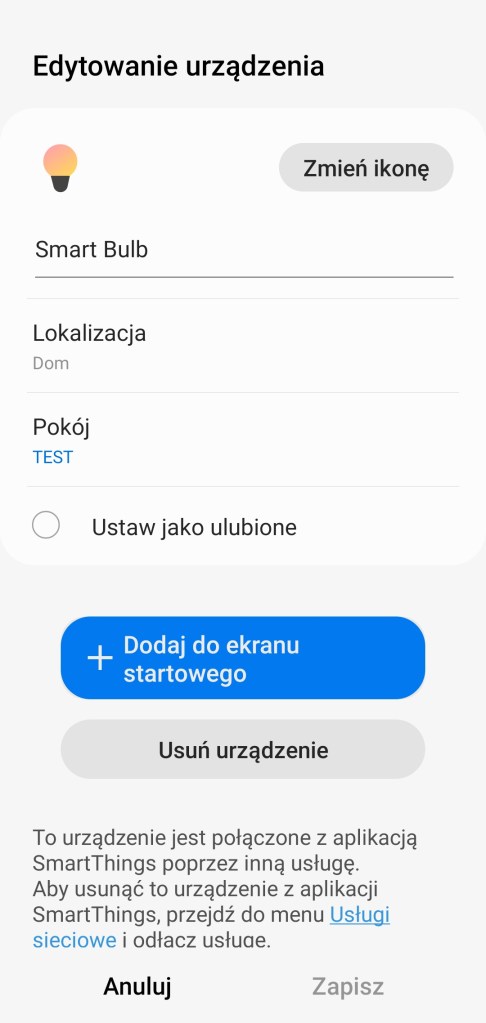 Aby usunąć żarówkę z ekosystemu SmartThings, należy wejść w główny ekran urządzenia. Kliknąć Więcej opcji ( ⋮ ) w prawym górnym rogu ekranu, a następnie Edytuj. W panelu edycji, wybieramy Usuń urządzenie. Następnie potwierdzamy operację, stukając Usuń. Pamiętaj, że usunięcie z aplikacji skutkuje również wyczyszczeniem urządzenia z wszelkich przypisanych procedur i scenerii. Należy pamiętać, aby usunąć żarówkę również z aplikacji Meross, ponieważ zostanie ono wykryte ponownie.
