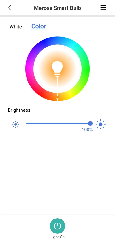 Żarówka Meross MSL120 pozwala na pełną możliwość sterowania światłem z palety kolorów RGB, zmienną barwę światła z ciepłej od 2700K na zimną do 6500K i możliwość ściemniania 0 – 100%. Wytwarza strumień światła sięgający 810 lumenów, jest to odpowiednik 60 W tradycyjnej żarówki. Żywotność to prawie 23 lata, przy 3 godzinach pracy dziennie, może się poszczycić klasą energetyczną A+. Żarówka komunikuje się za pomocą protokołu Wi-Fi (IEEE 802.11 b/g/n, 2.4GHz), więc nie jest bezpośrednio połączona z centralą, lecz poprzez serwer. Posiada klasyczne wymiary 13 cm wysokości i 7 cm średnicy, co odpowiada rozmiarowi A19. Do stosowania tylko w pomieszczeniach w temperaturze 0°C~40°C i wilgotności 10% ~ 90%. Zasilanie to 200-240V~, 50/60Hz, pobór mocy 9 W.