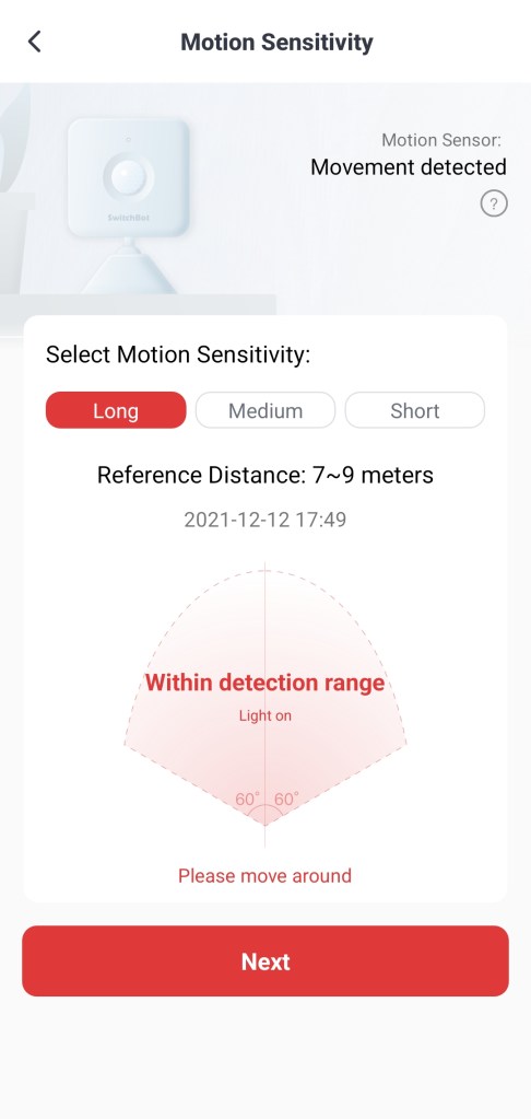 Sensor posiada w aplikacji SwitchBot dodatkowe ustawienia, które możemy dostosować do naszych potrzeb. Pierwszą z nich jest czy sensor ma wykrywać zmiany oświetlenia, za pomocą czujnika światła, posiadamy również możliwość jego kalibracji. Druga opcja to dostosowanie zasięgu czujnika ruchu, mamy do dyspozycji trzy opcje: szeroką, średnią oraz krótką.