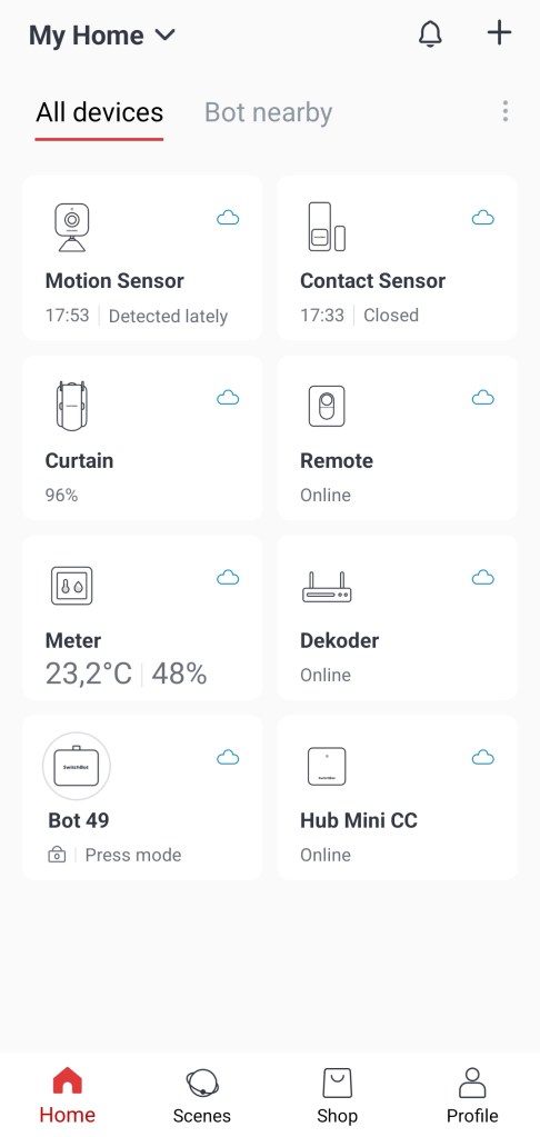 Musimy pamiętać, że produkty SwitchBot wykorzystują komunikację Bluetooth, w związku z tym niemożliwe jest bezpośrednie połączenie ich z centralą SmartThings. Tym samym komunikacja z urządzeniami odbywa się pośrednio z wykorzystaniem serwera. Wskazania urządzeń wysyłane są do centrali SwitchBot Hub Mini poprzez protokół Bluetooth, a ona łącząc się z routerem Wi-Fi wysyła informację na serwer, a stąd dopiero aktualizowany jest ich stan w aplikacji SmartThings. Jest to tak zwana integracja z chmury. Aby wyświetlić produkty SwitchBot w naszym inteligentnym domu, konieczne jest właśnie skorzystanie z połączenia usług. Tym samym przekłada się to na czas reakcji automatyzacji. Dzięki tej funkcji możemy korzystać z tak wielu produktów innych marek. Tym samym trzeba pamiętać, że po utracie połączenia internetowego, nie jest możliwe sterowanie i aktualizowanie stanów urządzeń, jak i zaprogramowanych zadań np. procedur. Status serwerów SwitchBot można sprawdzić tutaj.
