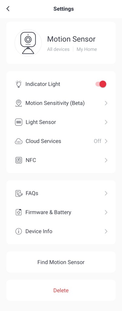 Aby uniknąć ponownego wyszukania czujnika ruchu przez aplikację SmartThings, należy również usunąć niechciany produkt z aplikacji SwitchBot. W tym celu wybieramy np. Motion Sensor w aplikacji SwitchBot, przechodzimy do ustawień, i z listy wybieramy Delete i potwierdzamy klikając Yes.