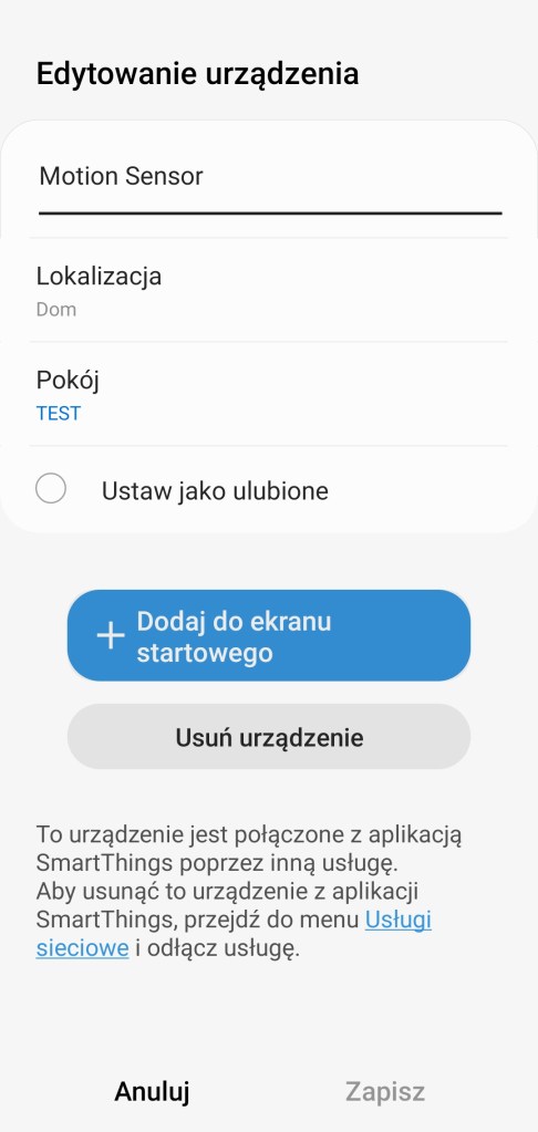 Usunąć czujnik ruchu możemy poprzez ustawienia „Edytuj” w aplikacji SmartThings, lecz nie zapobiegnie to ponownemu wykryciu urządzenia w przyszłości.