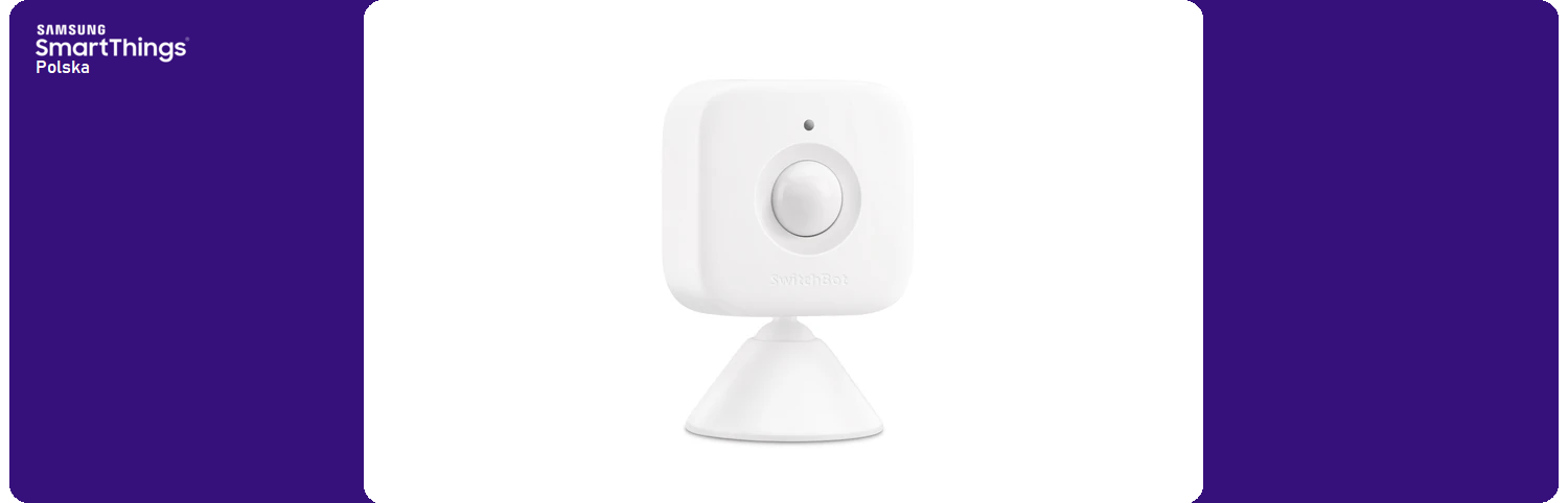 SwitchBot Contact Sensor umożliwia otrzymanie powiadomienia o wykryciu ruchu. Czujnik ruchu SwitchBot może wykrywać ruch ciała w zakresie do 9 metrów, pod kątem aż do 110° w poziomie i 55° w pionie. Możesz także ustawić ustawienia czułości, aby upewnić się, że zawsze wykrywasz właściwe obiekty, np. ignorując mniejsze, takie jak zwierzęta domowe. Dodatkowo umieszczono czujnik światła, dzięki czemu w aplikacji SwitchBot mamy informację czy wykryto zapalenie światła w domu, niestety brak tej informacji w aplikacji SmartThings. Komunikuje się za pomocą protokołu Bluetooth z wykorzystaniem centrali Hub Mini, tym samym nie jest bezpośrednio połączony z centralą SmartThings, tylko poprzez serwer. Powoduje to, dłuższy czas rekcji sięgający 1 -2 sekund na uruchomienie automatyzacji w aplikacji SmartThings. Sensor posiada wymiary 5,4 cm x 5,4 cm oraz 3 cm głębokości dodatkowo posiadamy podstawkę o średnicy 4,5 cm i 3,2 cm wysokości. Całość waży 56 gram plus 19 gram podstawka. Zasilany jest przez dwie baterie AAA (cienkie paluszki), producent deklaruje aż 3 lata działania, przy około 120 akcjach w ciągu doby. Dostosowany do pracy w pomieszczeniach w temperaturze -10°C – 60°C. Dostępny jest tylko w kolorze białym.