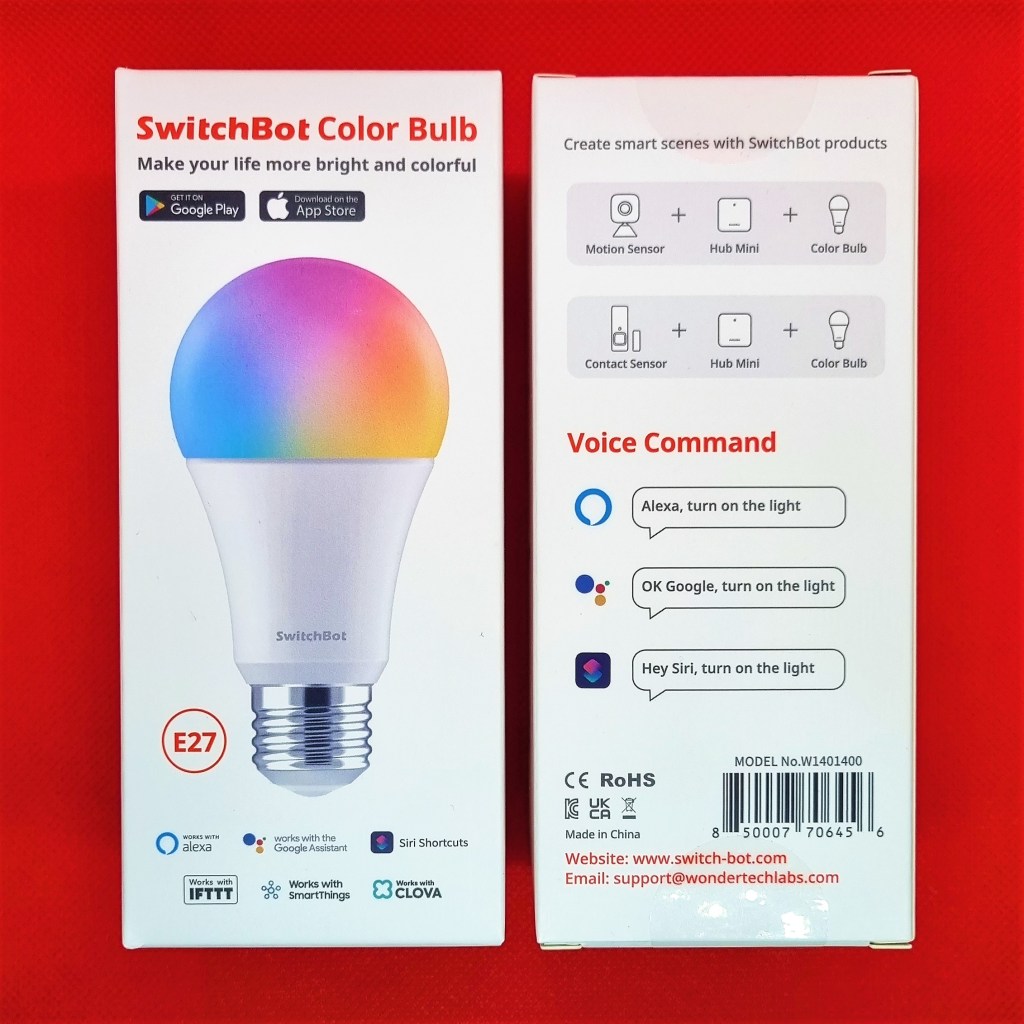 SwitchBot Color Bulb pozwala na pełną możliwość sterowania światłem z palety kolorów RGB, zmienną barwę światła z ciepłej od 2700K na zimną do 6500K i możliwość ściemniania 0 – 100%. Wytwarza strumień światła sięgający 800 lumenów, jest to odpowiednik 60 W tradycyjnej żarówki. Zapamiętuje ona stan przy awarii zasilania. Żywotność sięga 25 000 godzin. Żarówka komunikuje się za pomocą protokołu Wi-Fi (2.4GHz) i Bluetooth, z wykorzystaniem centrali Hub Mini, tym samym nie jest bezpośrednio połączony z centralą SmartThings, tylko poprzez serwer. Powoduje to, dłuższy czas rekcji sięgający 1 -2 sekund na uruchomienie automatyzacji w aplikacji SmartThings. Posiada klasyczne wymiary 11,6 cm wysokości i 6 cm średnicy, co odpowiada rozmiarowi A19. Do stosowania tylko w pomieszczeniach w temperaturze -15°C~40°C i wilgotności 10% ~ 90%. Zasilanie to 100-240V~, 50/60Hz, pobór mocy 10 W 100mA.