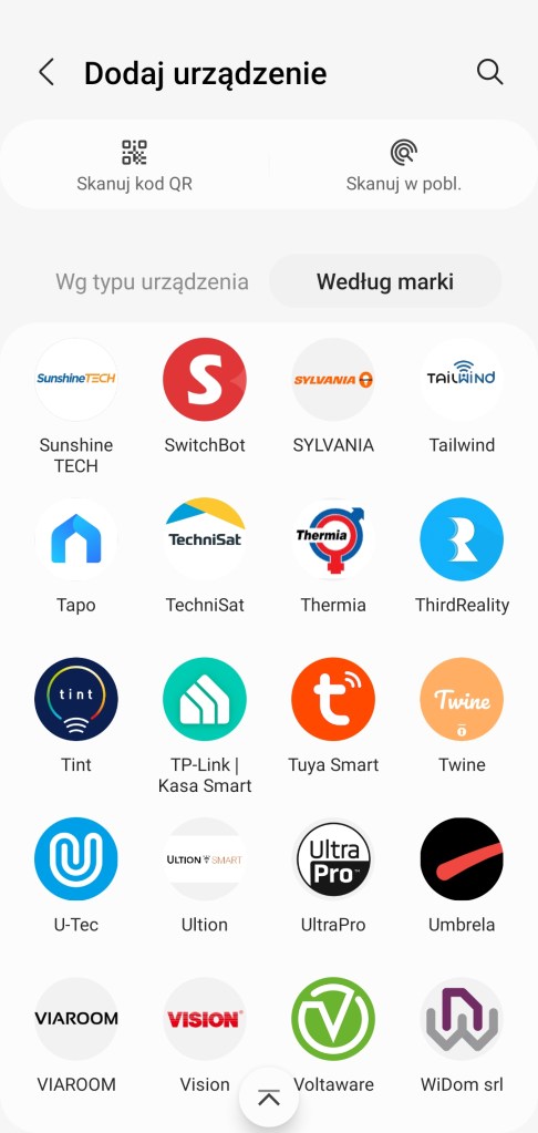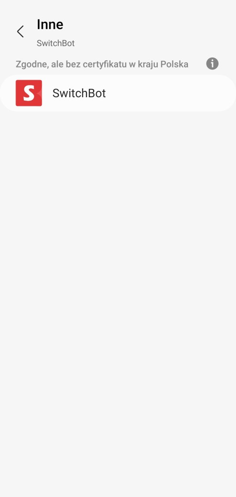 Jeśli posiadamy już zainstalowaną centralę i skonfigurowaną żarówkę SwitchBot. Przechodzimy do aplikacji SmartThings, na ekranie głównym, klikamy przycisk dodania ( + ), następnie Urządzenie, wyszukujemy markę SwitchBot, wybieramy Inne, ponownie wybieramy producenta. Następnie wybieramy centralę oraz pokój w jakim ma się zaleźć urządzenie. Po czym zostaniemy przeniesieni na stronę internetową SwitchBot, gdzie logujemy się na konto utworzone w aplikacji SwitchBot. Zostaniemy poinformowani o udanym połączeniu z ekosystemem SmartThings. Zamykamy iksem w lewym górnym rogu stronę internetową i po chwili pokaże nam się lista wszystkich urządzeń z aplikacji SwitchBot. Klikamy Gotowe, znalezione urządzenia pojawią się w wybranym pokoju.