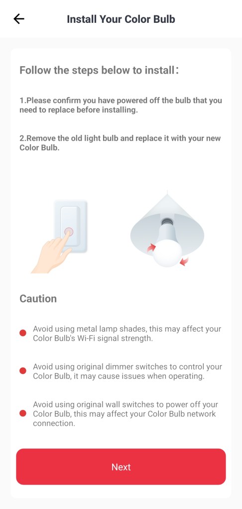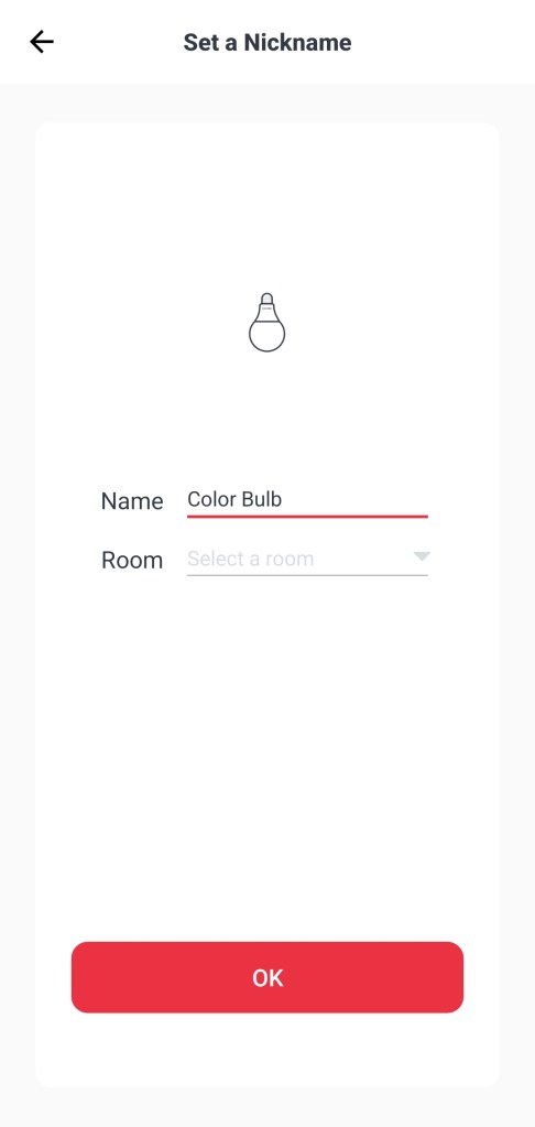 Mając już dodaną centralę Hub Mini, możemy dodać żarówkę SwitchBot Color Bulb. W tym celu, wkręcamy ją do gwinta E27/B22/E26 w naszym żyrandolu lub lampie, następnie uruchamiamy zasilanie włącznikiem ściennym. Klikamy w górnym prawym roku plusa ( + ) w aplikacji SwitchBot. Z listy odnajdujemy i klikamy urządzenie Color Bulb. Klikamy Next, po wyszukaniu żarówki, musimy podać login i hasło do osobistej sieci Wi-Fi. Należy pamiętać, że obsługiwana jest częstotliwość 2.4GH. Następnie nadajemy nazwę np. „Color Bulb” i ewentualnie wybieramy pokój. Klikamy OK, na koniec po pozytywnym dodaniu wyświetli się komunikat „Bingo”. Kończmy klikając OK. Żarówka pojawi się w sekcji Home aplikacji SwitchBot.