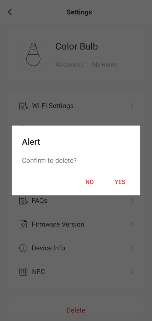 Aby uniknąć ponownego wyszukania SwitchBot Color Bulb przez aplikację SmartThings, należy również usunąć żarówkę z aplikacji SwitchBot. W tym celu wybieramy np. Color Bulb w aplikacji SwitchBot, z panelu sterowania żarówką, przechodzimy do ustawień, i z listy wybieramy Delete i potwierdzamy klikając Yes.