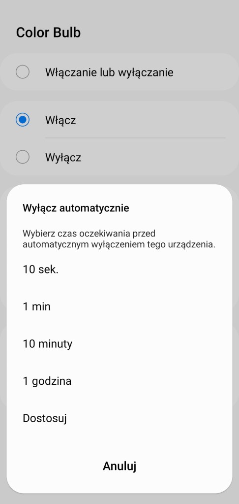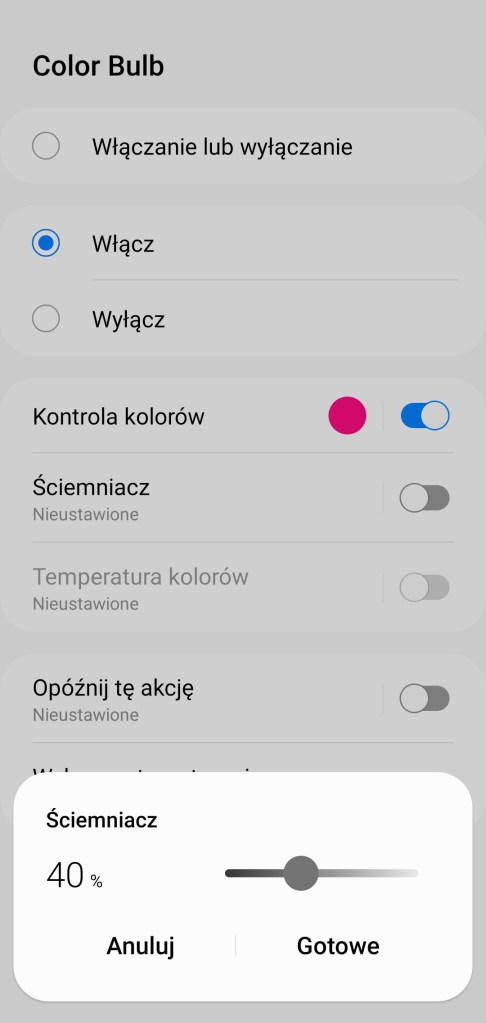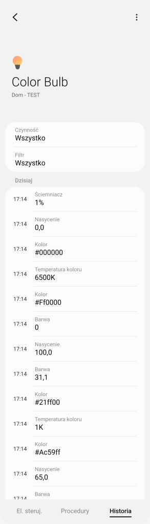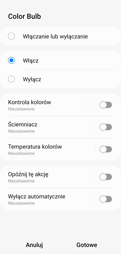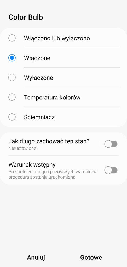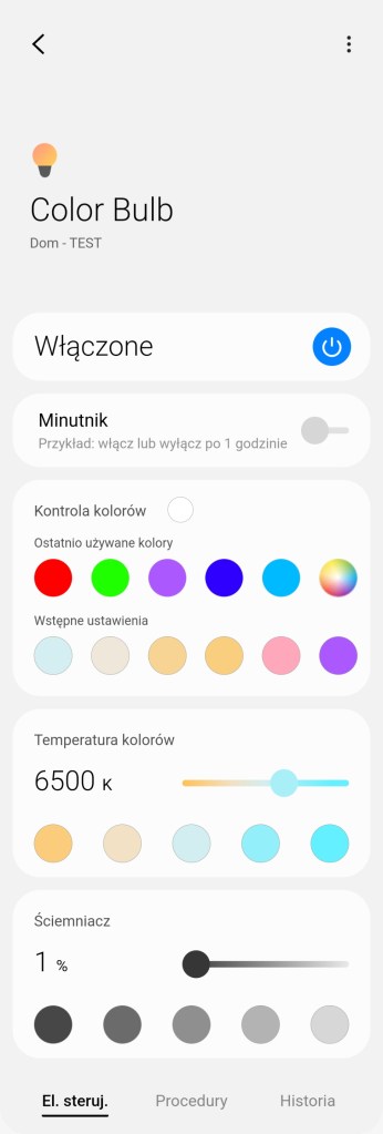 Tworzenie procedur (dawniej automatyzacje) „Jeśli … to Wtedy” musimy podzielić na dwa etapy, ponieważ znacznie różnią się dostępne opcje, jeśli inicjujemy warunek „Jeśli”. W pierwszej możliwości „Jeśli” urządzenie pozwala na wybranie opcji „Włączono lub wyłączono” czyli zmiana stanu, oraz „Włączone” i „Wyłączone”. Poniżej mamy wartość ściemniacza i temperatury kolorów z zakresu 2200 – 9000 K. Choć wiemy, że żarówka pozwala na zakres 2700 – 6500 K. Dodatkowo posiadamy opcję jak długo zachowany powinien być stan przed uruchomieniem automatyzacji oraz czy ma być to warunek wstępny. W drugiej możliwości „Wtedy”, żarówka pozwala na dużo więcej, mamy pełną możliwość tworzenia opcji przydatnych w programowaniu już np. scenerii. Mamy ponownie opcje „Włączono lub wyłączono” czyli zmiana stanu, oraz „Włączone” i „Wyłączone”. Ustawienie jednego z kolorów, jasności żarówki z zakresu 0 – 100%, bądź temperatury barwy z zakresu 2200 – 9000 K. Choć wiemy, że żarówka pozwala na zakres 2700 – 6500 K. Akcję uruchomienia lampy możemy opóźnić o dowolny czas, jak i wyłączyć ją automatycznie po ustalonym czasie.