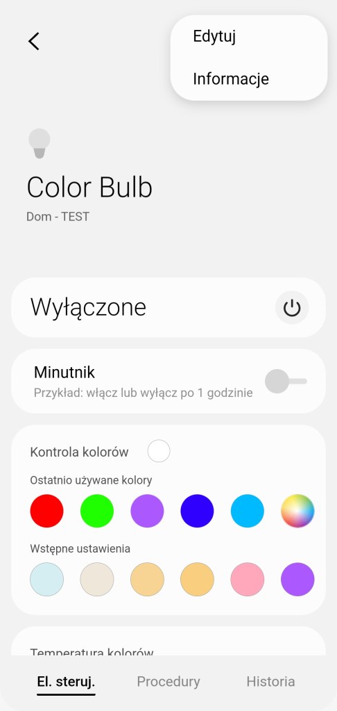 W głównym panelu aplikacji mamy możliwość włączenia/wyłączenia żarówki SwitchBot, możliwość ustawienia minutnika. Poniżej posiadamy możliwość ustawienia dowolnego koloru z palety barw RGB, jak i pięć ostatnio używanych kolorów oraz sześć sugestii. Kolejna belka umożliwia ustawienie temperatury światła w zakresie 2200 K – 9000 K, choć realnie jest to 2700-6500 K, jest to mały błąd. Ostatnia opcja pozwala na ustawienie ściemniacza od 1 do 100%. Pod ściemniaczem posiadamy również pięć kół, będących przyciskami ustawiającymi ściemniacz na kolejno od lewej 10%, 30%, 50%, 70% oraz 90% jasności. Na dole znajdziemy sekcję panel „Procedury” (dawniej „Automatyzacje„) znajdziemy tutaj szybkie procedury: włączenia i wyłączenia żarówki o danej porze dnia oraz listę procedur gdzie używane jest urządzenie. Panel „Historii” nie różni się znacznie od innych urządzeń, mamy dostęp do sortowania i przestudiowania historii działań żarówki. W ustawieniach „Edytuj” mamy standardową możliwość zmiany nazwy, lokalizacji, pokoju oraz możliwość dodania do panelu „Ulubione”.