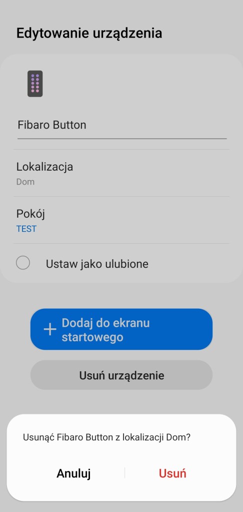 Aby usunąć przycisk FIBARO z ekosystemu SmartThings, należy wejść w główny ekran urządzenia. Kliknąć Więcej opcji ( ⋮ ) w prawym górnym rogu ekranu, a następnie Edytuj. W panelu edycji, wybieramy Usuń urządzenie. Następnie potwierdzamy operację, stukając Usuń.