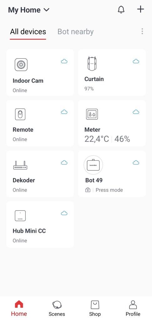 Przed rozpoczęciem instancji podłączamy za pomocą kabla USB kamerę do zasilania. Opcjonalnie możemy już na tym etapie włożyć kartę pamięci microSD. Aby zainstalować kamerę przechodzimy do aplikacji SwitchBot, wybieramy dodanie nowego urządzenia, klikając Dodaj ( + ), w prawym górnym rogu ekranu. Następnie z listy wybieramy Indoor Cam, upewniamy się czy świeci się czerwona dioda na urządzeniu. Przeprowadzamy łączenie z naszą siecią Wi-Fi. Pamiętając, że obsługiwana jest tylko częstotliwość 2.4GHz. Na ekranie aplikacji SwitchBot ukaże się kod QR, który należy pokazać obiektywowi kamery. Po pozytywnym zweryfikowaniu, nadajemy nazwę kamerze i kończymy proces klikając Use now. Na koniec pojawi się ekran ze wszystkimi urządzeniami.