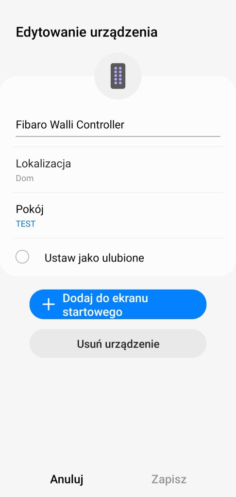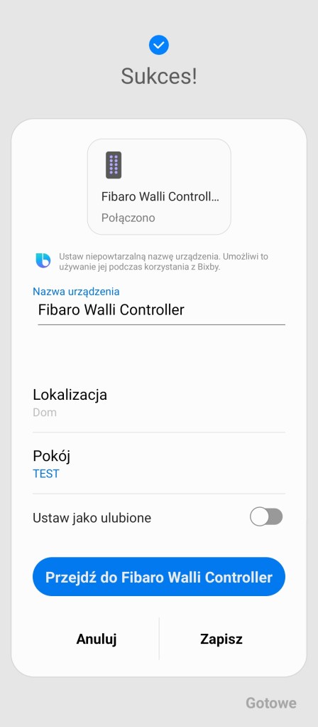 Następnie możemy przejść do dodania Walli Controller do platformy SmartThings. Klikamy na ekranie głównym aplikacji SmartThings, przycisk Dodaj ( + ), w prawym górnym rogu ekranu. Następnie Urządzenie, przesuwamy w dół do sekcji marek Wybór z listy urządzeń, wybieramy markę FIBARO, a później Przełącznik/ściemniacz. Z dostępnej listy wybieramy opcję Switches and Dimmers. Kontynuujemy pierwsze kroki, wybierając centralę i pomieszczenie dla urządzenia. Następnie kliknij trzykrotnie dowolny przycisk. Wymagane będzie podanie kodu zabezpieczeń lub zeskanowanie kodu QR. Po pomyślnym znalezieniu urządzenia, możemy zmienić jego nazwę. Kończymy proces instalacji, klikając Gotowe. Jak możecie zauważyć niestety system nie przypisał odpowiedniego sterownika urządzeniowi. Będzie konieczne jego ręczna zmiana.