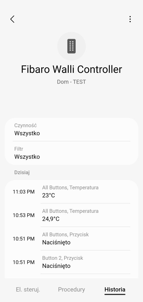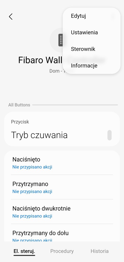 W głównym panelu aplikacji mamy możliwość zaprogramowania sekwencji kliknięć: : 1 kliknięcie, 2 kliknięcia, 3 kliknięcia oraz przytrzymanie przycisku. Naciśnięcie do dołu jest utożsamiane z przytrzymaniem. Posiadamy informację o zmierzonej temperaturze. Ostatnią informacją jest stan baterii. Całość jest podzielona na 3 sekcje: All Buttons – reaaguje bez względu, który przycisk zostanie kliknięty; sekcja Button 1 odpowiada górnemu klawiszowi, zaś Button 2 dolnemu klawiszowi. Na dole znajdziemy sekcję panel „Procedury” (dawniej „Automatyzacje„) znajdziemy listę procedur, gdzie używany jest pilot. Panel „Historii” również nie różni się znacznie od innych urządzeń, mamy dostęp do sortowania i przestudiowania historii działań przycisku. W ustawieniach „Edytuj” mamy standardową możliwość zmiany nazwy, lokalizacji, pokoju oraz możliwość dodania do panelu „Ulubione”.