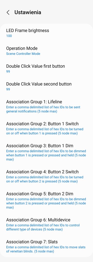 Niestety ze względu na brak dedykowanego sterownika w ekosystemie SmartThings mamy dość ograniczone możliwości urządzenia. Odnajdywany jest, jako przycisk pojedynczy, tym samym wybierane sekwencje: 1 kliknięcie, 2 kliknięcia, 3 kliknięcia oraz przytrzymanie przypisywane są obu przyciskom, niezależnie czy klikniemy górny czy dolny. Dodatkowo nie posiadamy odczytów temperatury ani stanu akumulatora. Brak również dodatkowych opcji znanych z Walli Dimmer, dotyczących zmiany kolorów paska LED.