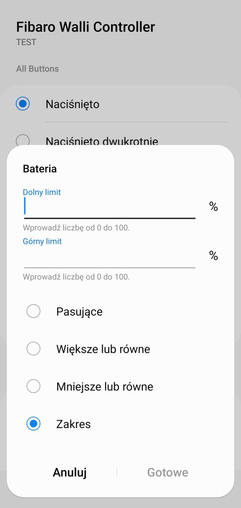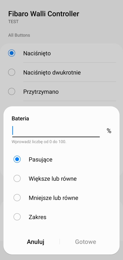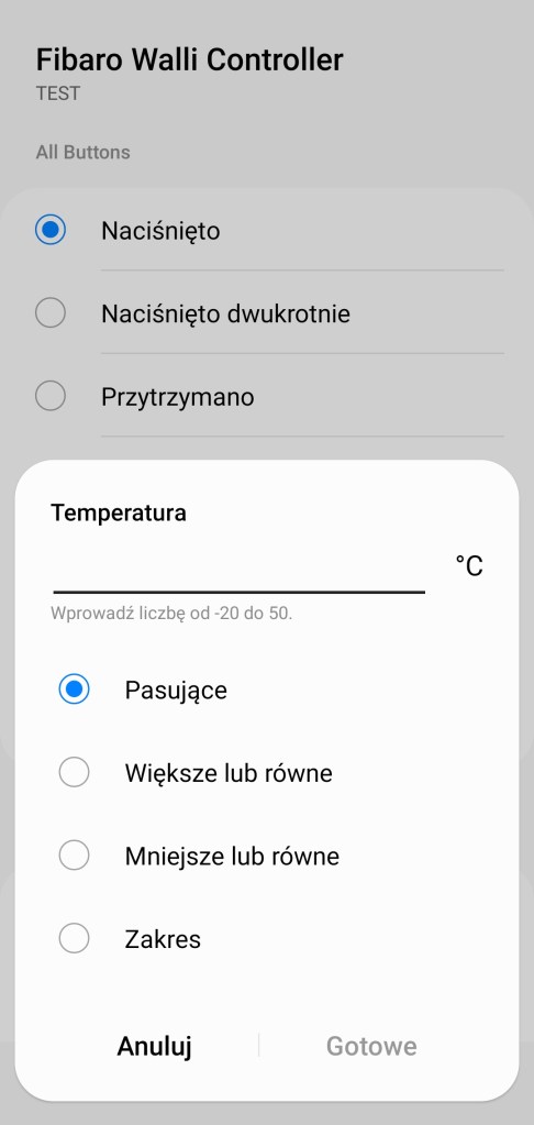 Przy tworzeniu procedur, dawniej automatyzacje „Jeśli … to Wtedy”, ze względu na specyfikę urządzenia mamy do wyboru tylko opcję „Jeśli”, gdzie mamy możliwość wybrania już wcześniej wspomnianych opcji kiedy naciśnięto, dwukrotnie naciśnięto, naciśnięto 3 razy oraz przytrzymano przycisk/przytrzymano do dołu. Następnie jest opcja „Temperatura”, czyli powiadomienie o temperaturze z zakresu -20 – 50°C, w tym czy są większa/mniejsza niż odczytana oraz wyznaczony zakres. Ostatnia informacja dotyczy poziomu baterii, mierzonej w zakresie 0 – 100% w tym, czy jest pasująca, większa/mniejsza czy w określonym zakresie. Znów widnieje podział na 3 sekcje: Button 1 to przycisk górny, Button 2 to przycisk dolny, zaś All Buttons odczytuje użycie bez względu na to który przycisk zostanie użyty.