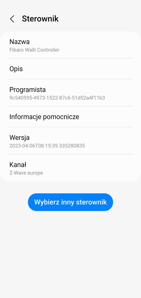 Sterownik Edge moża również zmienić, jeśli obecny został źle przypisany, lub używany nie spełnia oczekiwań. Aby zmienić sterownik należy wejść panel sterowania urządzenia. Następnie klikamy Więcej opcji ( ⋮ ), z listy wybieramy Sterownik i Wybierz inny sterownik. Z listy dostępnych wybierz sterownik Fibaro Walli Controller od developera Z-wave Europe. Z przeprowadzonych testów wynika, że ten najlepiej komunikuje się z urządzeniem. W przyszłości inne nowsze sterowniki lub stworzone przez społeczność SmartThings mogą posiadać bardziej rozbudowane funkcje, zachęcamy do eksperymentów. Potwierdzamy wybór sterownika Fibaro Walli Controller, klikając OK. Możecie zauważyć, że zmieniła się ikona i dostępne opcje sterowania urządzeniem.