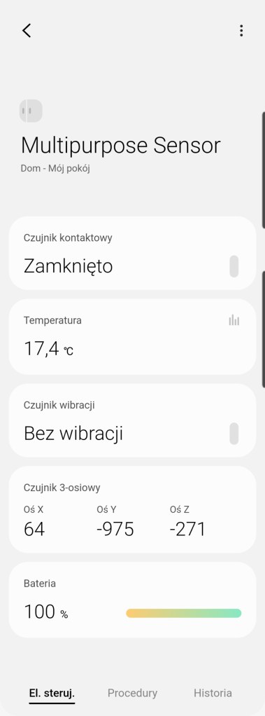 W głównym panelu aplikacji SmartThings mamy informację czy czujnik „Otwarto”/„Zamknięto”. Informacje o temperaturze, alert o wykryciu wibracji, czujnik żyroskopowy (przydatny przy zamontowaniu na bramach garażowych) oraz procentową informację o baterii. Na dole znajdziemy sekcję panel „Procedury” (dawniej „Automatyzacje„) znajdziemy tutaj listę procedur, gdzie używany jest sensor. Panel „Historii” również nie różni się znacznie od innych urządzeń, mamy dostęp do sortowania i przestudiowania historii działań czujnika. W ustawieniach „Edytuj” mamy standardową możliwość zmiany nazwy, lokalizacji, pokoju oraz możliwość dodania do panelu „Ulubione”. W dodatkowych opcjach mamy możliwość korygowania temperatury oraz czy czujnik wykorzystujemy w bramie garażowej.