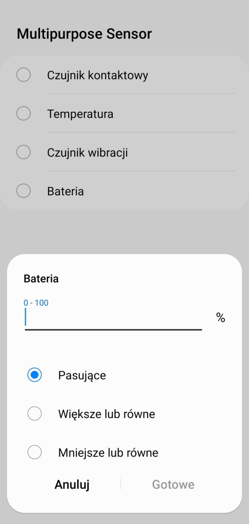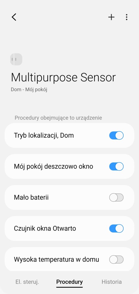 Przy tworzeniu procedur, dawniej automatyzacje „Jeśli … to Wtedy”, ze względu na specyfikę urządzenia, możliwe jest tylko wykorzystanie warunku „jeśli”. Mamy możliwość wybrania stanu czujnika „Otwarto”, „Zamknięto” oraz „Otwarto lub Zamknięto”. Uzyskamy powiadomienie o temperaturze z zakresu -20°C – 100°C w tym, czy są większe/mniejsze niż podana, czy wykryto wibrację czujnika oraz o poziomie baterii z zakresu 0 – 100% w tym, czy są większe/mniejsze niż podana.