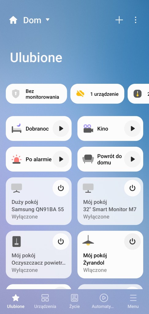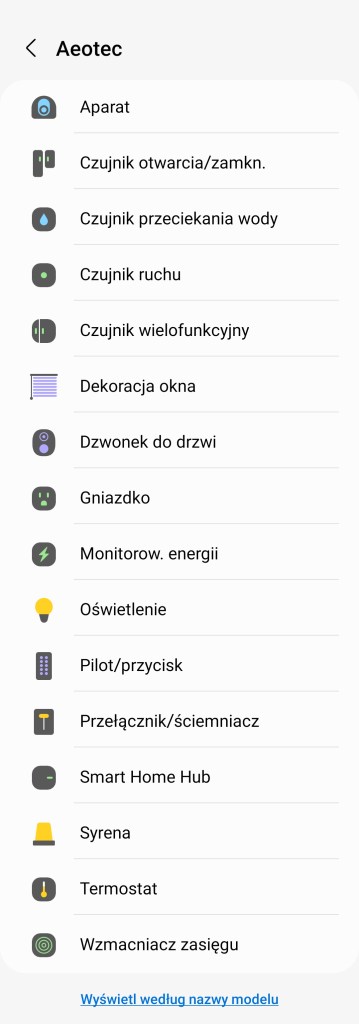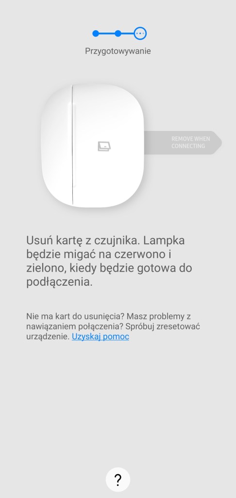 Dodanie do ekosystemu jest proste, należy postępować zgodnie z instrukcją w aplikacji. Klikamy w aplikacji Dodaj ( + ), w prawym górnym rogu ekranu. Następnie wybieramy markę Aeotec >> Czujnik wielofunkcyjny i model urządzenia, czyli Multipurpose Sensor IM6001-MPP. Czekamy na przygotowanie konfiguracji. Kontynuujemy pierwsze kroki, wybieramy koncentrator i pomieszczenie dla urządzenia. Tutaj mamy możliwość zeskanowania kodu z tyłu urządzenia bądź pominięcia tego kroku. Musimy teraz wyciągnąć taśmę z czujnika. Poczekać na wykrycie czujnika, pozostaje już tylko nadać nazwę sensorowi i kliknąć Gotowe.