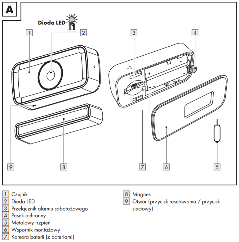 1. Dzięki magnesowi czujnik wykrywa otwarcie/zamknięcie. Główne urządzenie (duży element), po zbliżeniu mniejszego elementu — może stwierdzić obecny stan drzwi/okna.