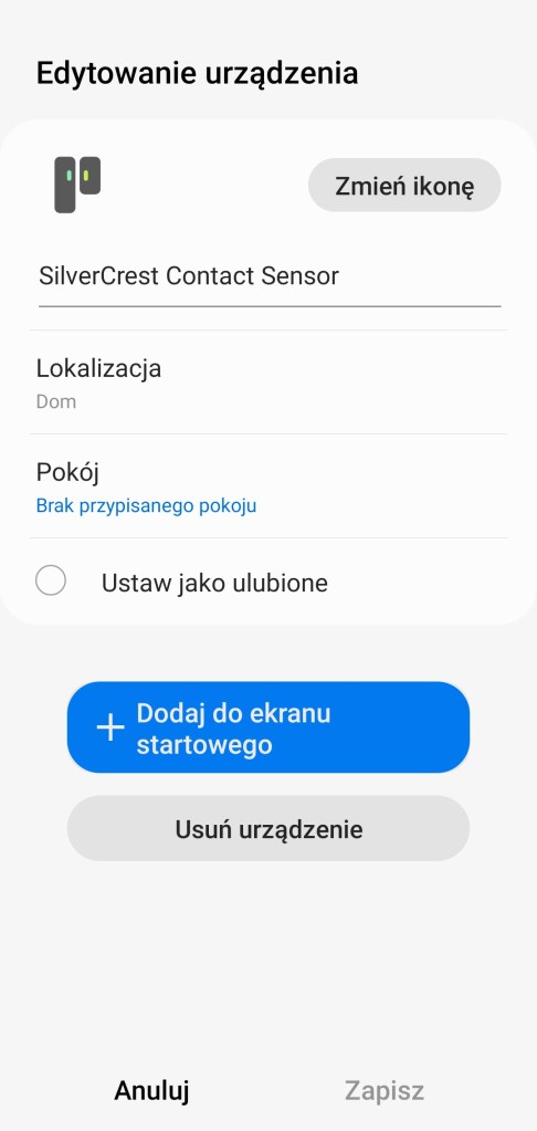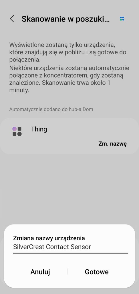 Z racji tego, że urządzenie nie jest oficjalnie wspierane. Dodanie do ekosystemu do prostych nie należy. Początkowo działamy zgodnie z informacjami w aplikacji SmartThings. Klikamy w aplikacji Dodaj ( + ), w prawym górnym rogu ekranu. Następnie Urządzenie, ponieważ nie mamy wyszczególnionej marki SILVERCREST w aplikacji SmartThings, skorzystamy z opcji skanowania w poszukiwaniu urządzeń w pobliżu, klikamy Skanuj w tej sekcji. Po chwili cierpliwości (do około 2 minut), nasz sensor zostanie automatycznie dodany do ekosystemu. Możemy teraz zmienić jego nazwę, my nadaliśmy mu nazwę „SilverCrest Centact Sensor”, klikamy Gotowe. Czujnik pojawi się w sekcji „Brak przypisanego pokoju”. Niestety jak możecie zauważyć na ostatnim screenie, nie prawidłowo został mu przypisany sterownik urządzenia, jeśli pojawi się taka sytuacja, skorzystaj z instrukcji poniżej.