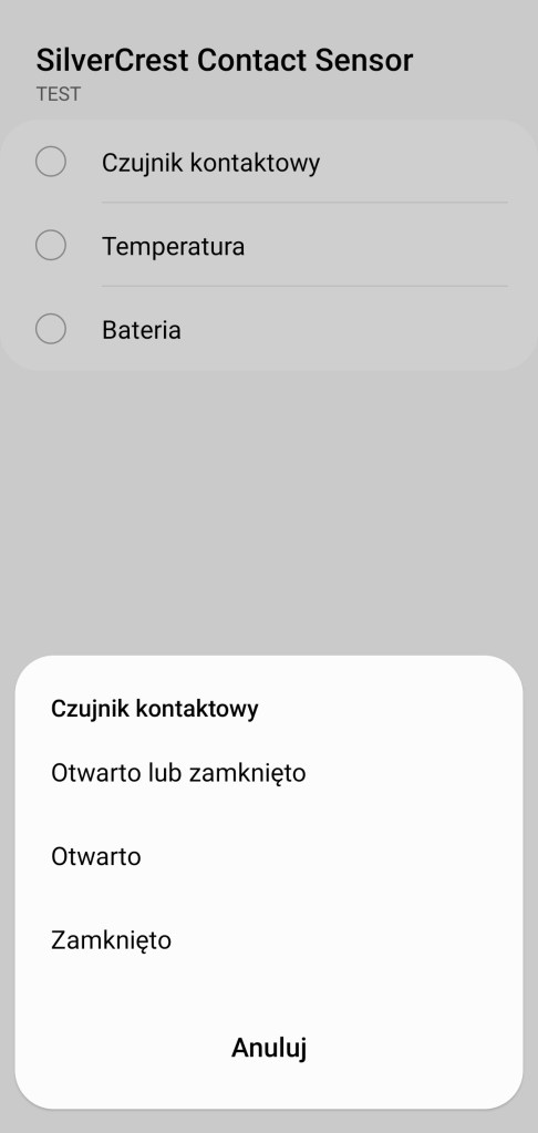 Przy tworzeniu procedur, dawniej automatyzacje „Jeśli … to Wtedy”, ze względu na specyfikę urządzenia, możliwe jest tylko wykorzystanie warunku „jeśli”. Posiadamy możliwość wybrania stanu czujnika „Otwarto”, „Zamknięto” oraz „Otwarto lub Zamknięto”,czyli zmiana stanu. Posiadamy tutaj opcję dotyczącą temperatury, lecz jak wiemy ze specyfikacji urządzenie go nie posiada. Ostatnią opcją jest powiadomienie o poziomie baterii z zakresu 0 – 100% w tym czy są większe/mniejsze niż podana.