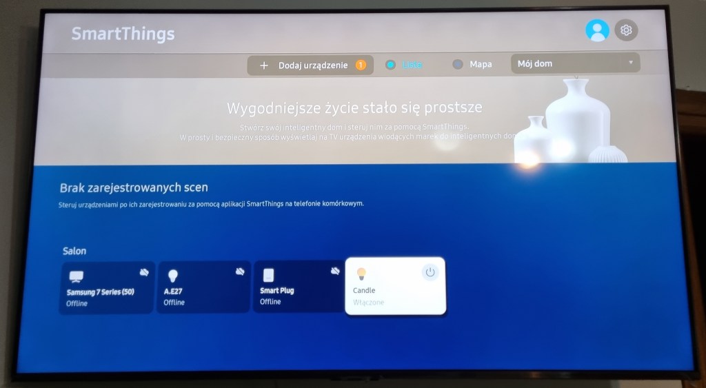 Telewizor Samsung posiada preinstalowaną aplikację SmartThings, zintegrowany z SmartHub, o nim w następnym rozdziale. Aplikacja pozwala na dostęp do wszystkich urządzeń podłączonych w inteligentnym domu. Posiadamy listę scen – o ile zostały zdefiniowane. Jest również możliwość wybrania lokalizacji (wirtualnego domu), jeśli tylko posiadamy więcej niż jedną.