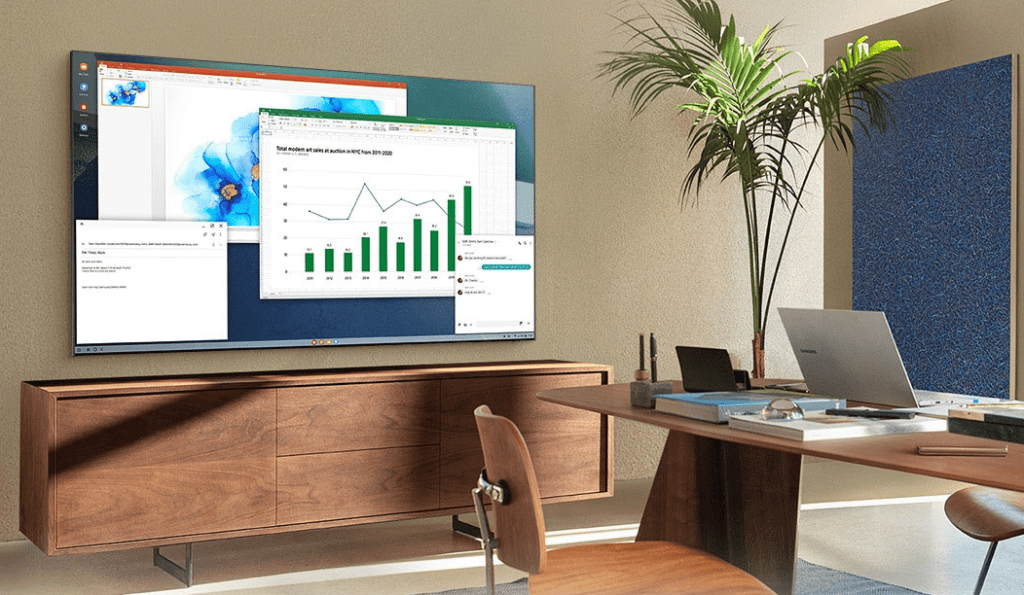 Praca z domu – słynny już home office. Zamień swój salon w domowe biuro lub salę lekcyjną. Skorzystaj z bezprzewodowego połączenia ze swoim komputerem, laptopem lub telefonem i ciesz się możliwością pracy zdalnej przed telewizorem. Funkcja obsługuje Office 365 oraz tryb Samsung DeX.