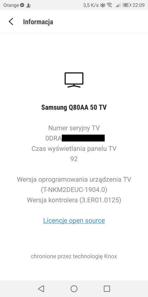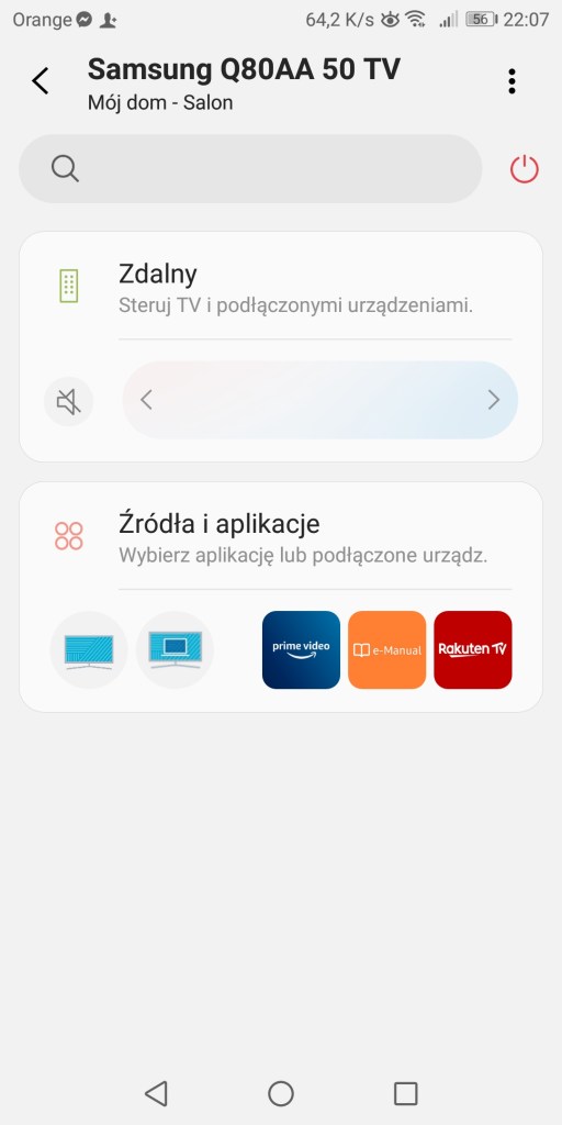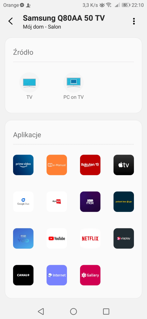 W głównym panelu aplikacji mamy możliwość uruchomienia telewizora, wyszukania oraz zminimalizowaną sekcję dotyczącą zdalnego pilota TV. W ostatniej sekcji „Źródła i aplikacje” możemy wybrać wyświetlane na TV źródło bądź aplikację. Po wyświetleniu opcji „Ustawienia” możemy podejrzeć aktualnie wyświetlany program, kanał TV oraz czas trwania (tylko w opcji skonfigurowanego tunera naziemnej lub satelitarnej telewizji). Następnie dostęp do ustawień trybu Ambient, proste logowanie, dobrze nam znane „Edytuj”, gdzie mamy standardową możliwość zmiany nazwy, lokalizacji, pokoju czy dodania do panelu „Ulubione”. Kolejną opcją ustawień są efekt wibracji na pilocie, uaktualnienie danych oraz informacje, gdzie znajdziemy numer seryjny TV, wersję oprogramowania i licencje.