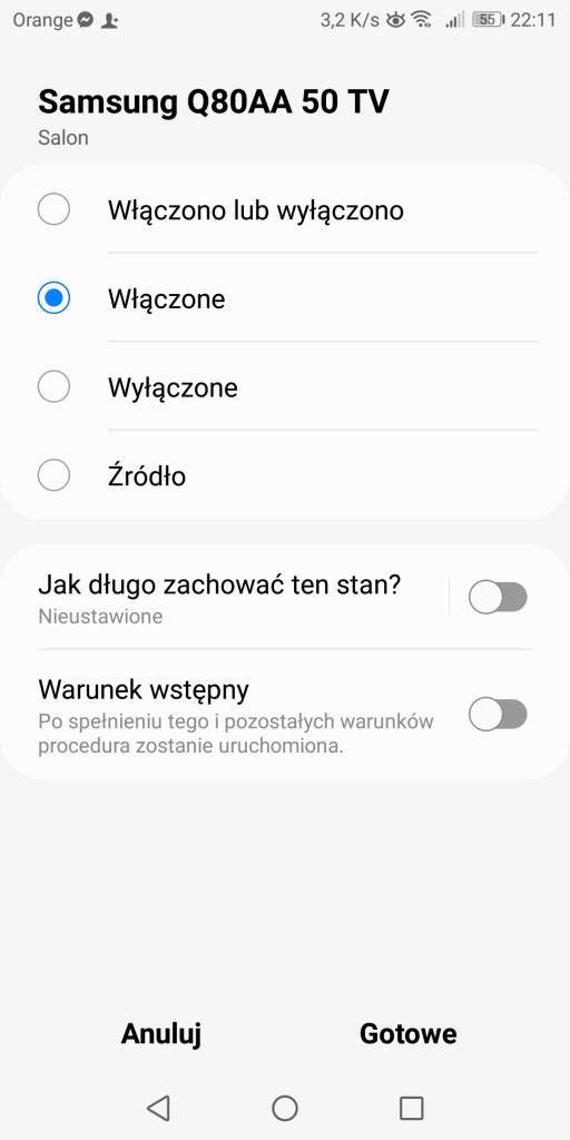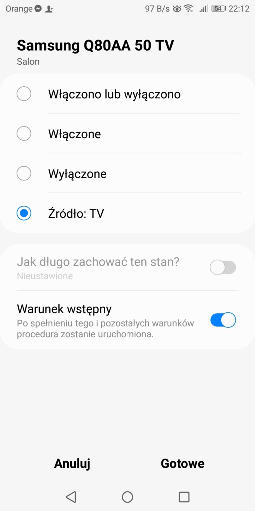 Tworzenie procedur (dawniej automatyzacje) „Jeśli … to Wtedy” musimy podzielić na dwa etapy, ponieważ znacznie różnią się dostępne opcje, jeśli inicjujemy warunek „Jeśli”. W pierwszej możliwości „Jeśli” telewizor pozwala na wybranie czy został zmieniony jego stan na „Włączono lub wyłączono”, „Włączony” oraz „Wyłączony”, oraz wybranie obecnie uruchomionego źródła obrazu „TV” – odnosi się do telewizji naziemnej. W przypadku podpięcia do złącz HDMI innych urządzeń, pojawią się one tutaj. Dodatkowo posiadamy opcję, jak długo zachowany powinien być stan przed uruchomieniem automatyzacji oraz czy ma być to warunek wstępny.