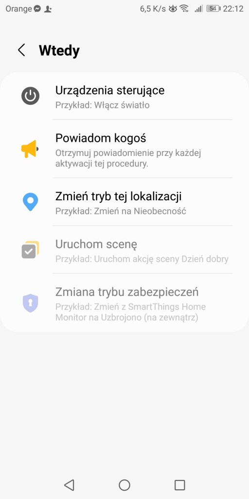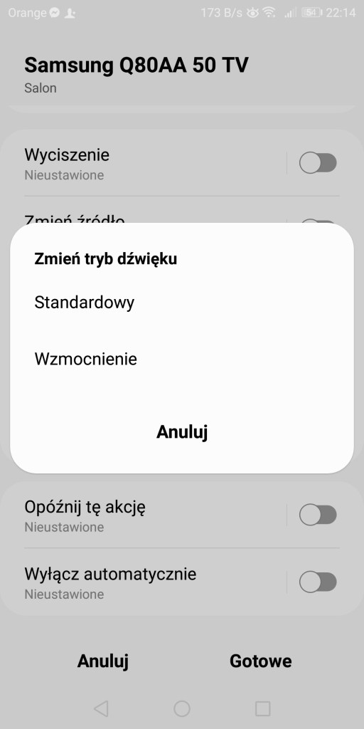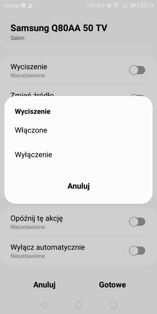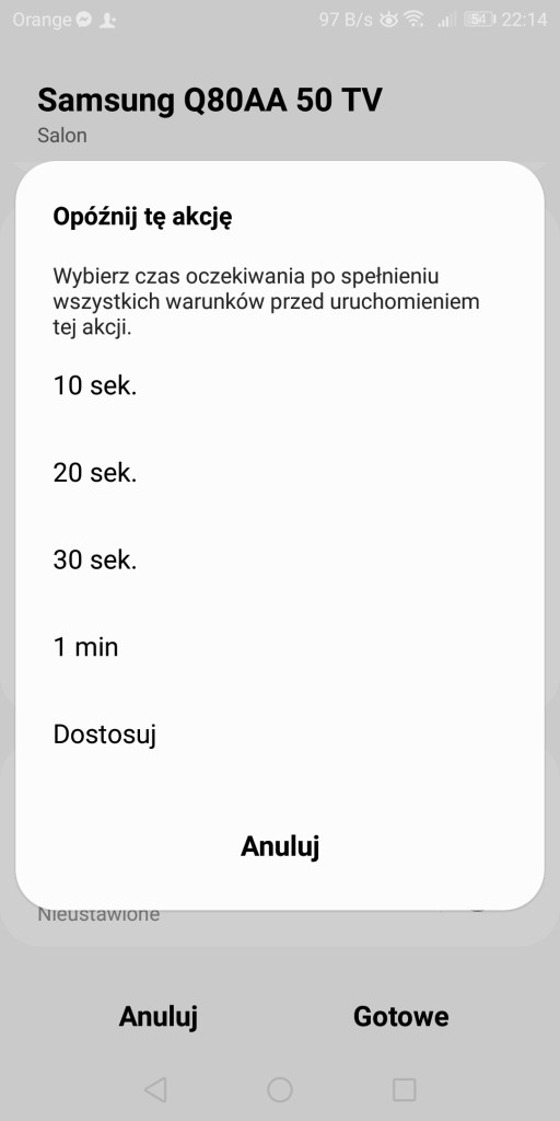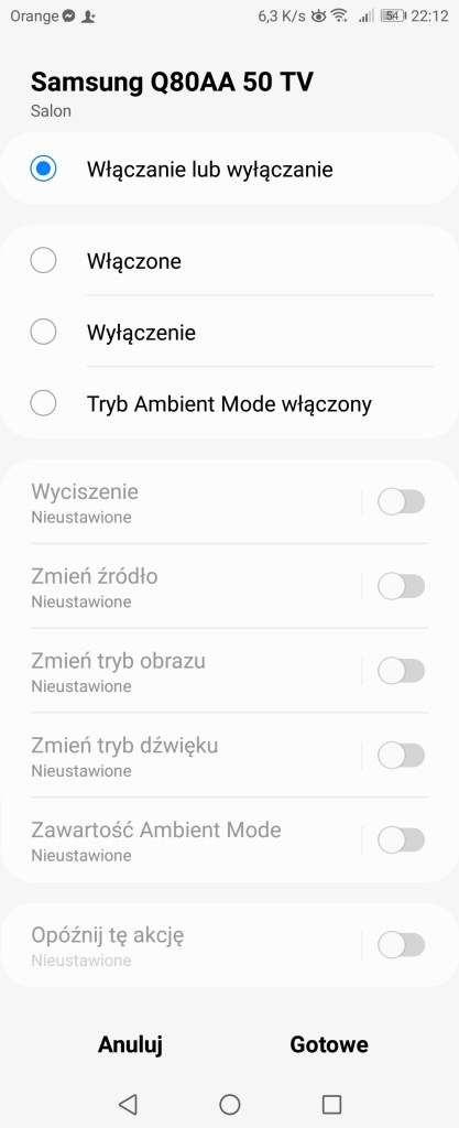 W drugiej możliwości „Wtedy”, telewizor pozwala na zmianę stanu z „Włączono lub wyłączono”, włączenie telewizora „Włączony” i jego wyłączenie „Wyłączony”. Jest możliwość wyciszenia, zmiany źródła ekranu, zmianę trybu obrazu oraz dźwięku. Akcję uruchomienia automatyzacji możemy opóźnić o dowolny czas, jak i ją wyłączyć (odwrócić stan) automatycznie po ustalonym czasie.