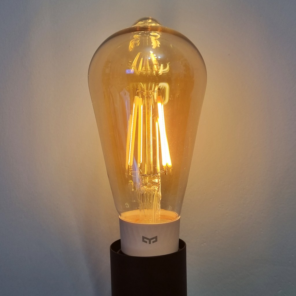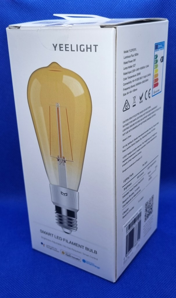 Yeelight Smart LED Filament (model YLDP23YL) to żarówka LED w kształcie ST64 z trzonkiem E27, ze stałą temperaturą barwy na poziomie 2000 K, dająca ciepłą barwę światła, posiadająca dodatkowo opcję ściemniania (5 – 100%). Maksymalnie dostaniemy tylko 500 lm jasności, czyli o 300 lm mniej od tradycyjnego odpowiednika Yeelight. Żarówka ma moc sięgającą do 6W, napięcie zaś 220-240V~50/60Hz 0.04. Producent zapewnia o żywotności 15 000 godzin, co pozwala na użytkownie przez ponad 11 lat (przy 3 godzinach pracy dziennie), dodatkowo może się poszczycić klasą energetyczną A+. Komunikacja odbywa się po protokole Wi-Fi (802.11 b/g/n 2,4 GHz) i za pośrednictwem serwera, co opóźnia reakcję na komendę, do tego jeszcze wrócimy w dalszej części wpisu. Dużym plusem jest, że żarówki od Yeelight nie wymagają żadnego dodatkowego huba. Wymiary to 15,8 cm wysokości oraz 6,4 cm średnicy.